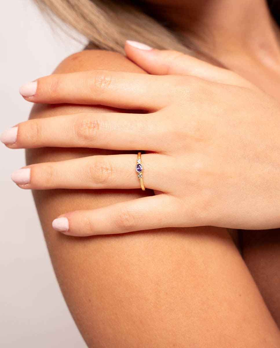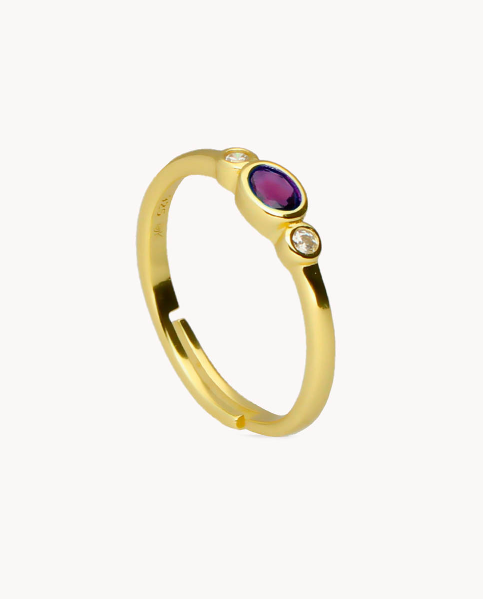 Anillo de plata de ley 925 bañada en oro 18K con circonita central color amatista y forma ovalada de 4 mm x 3 mm (largo por ancho) y dos circonitas blancas en ambos laterales de 2 mm de diámetro, medida regulable (12-14 y 16-18).