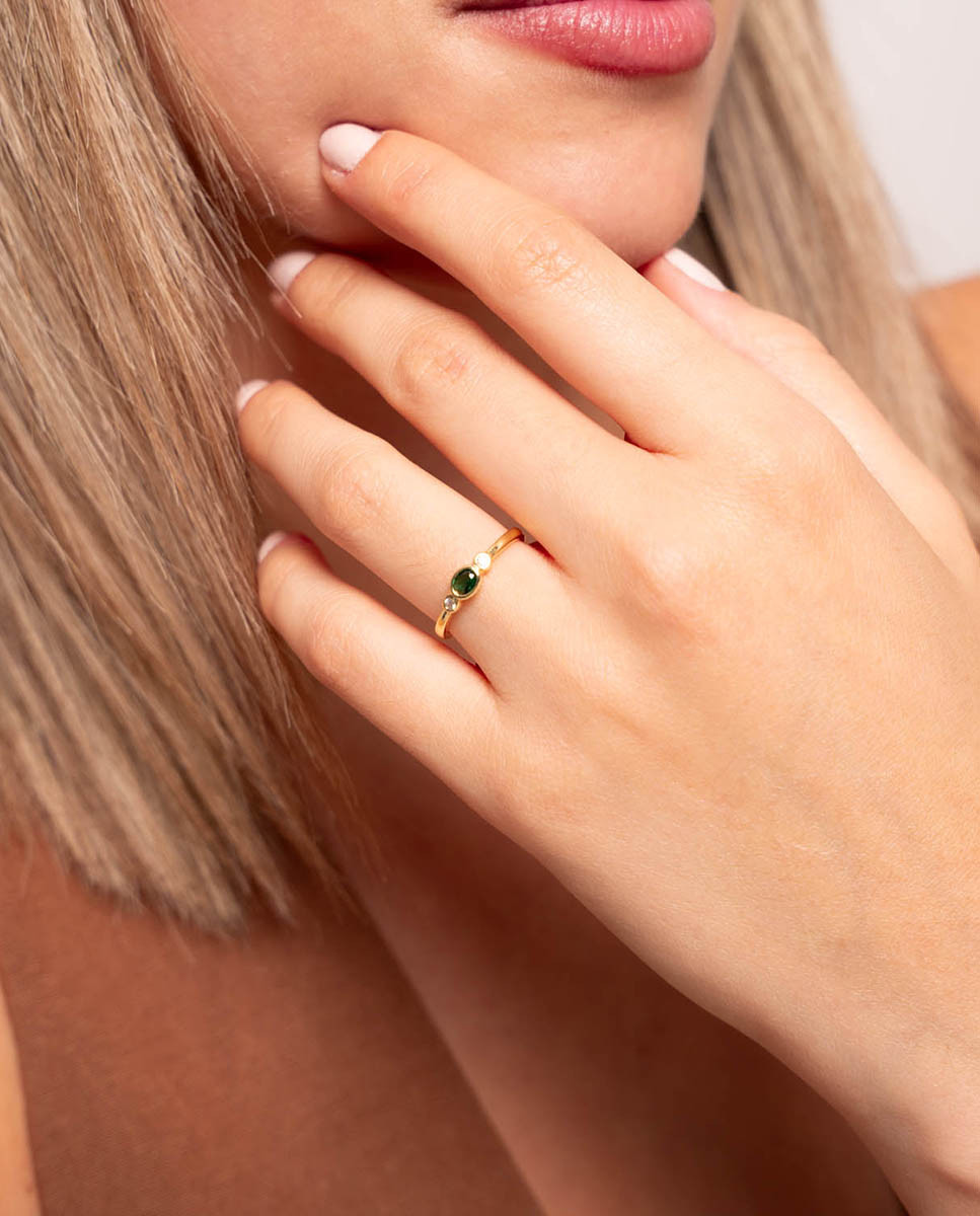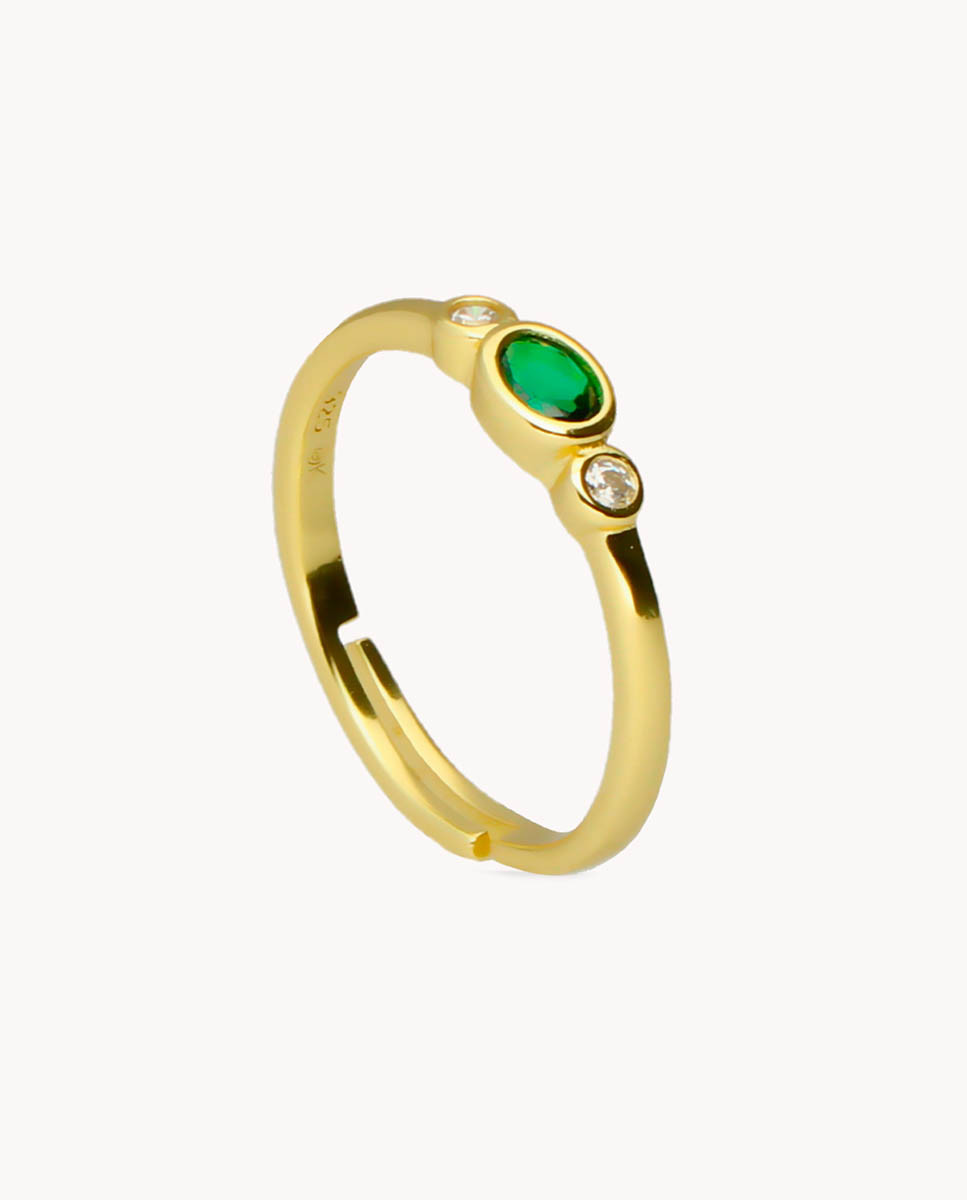 Anillo de plata de ley 925 bañada en oro 18K con circonita central color esmeralda y forma ovalada de 4 mm x 3 mm (largo por ancho) y dos circonitas blancas en ambos laterales de 2 mm de diámetro, medida regulable (12-14 y 16-18).
