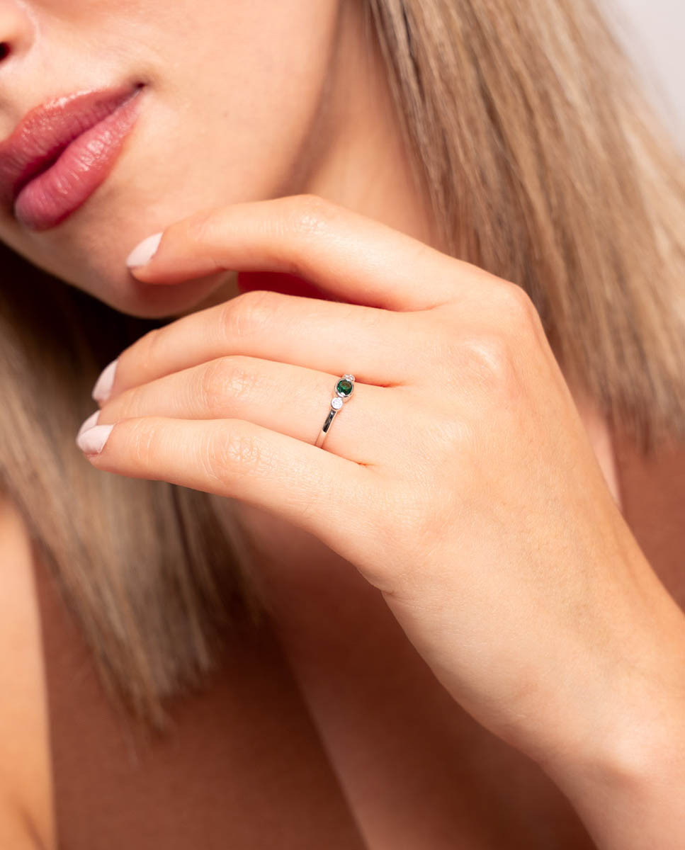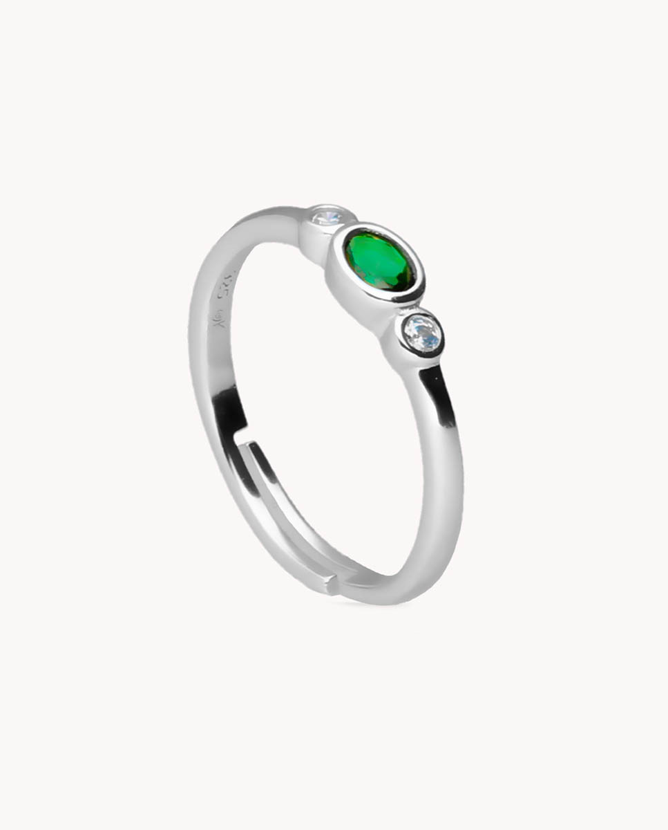 Anillo de plata de ley 925 bañada en rodio con circonita central color esmeralda y forma ovalada de 4 mm x 3 mm (largo por ancho) y dos circonitas blancas en ambos laterales de 2 mm de diámetro, medida regulable (12-14 y 16-18).