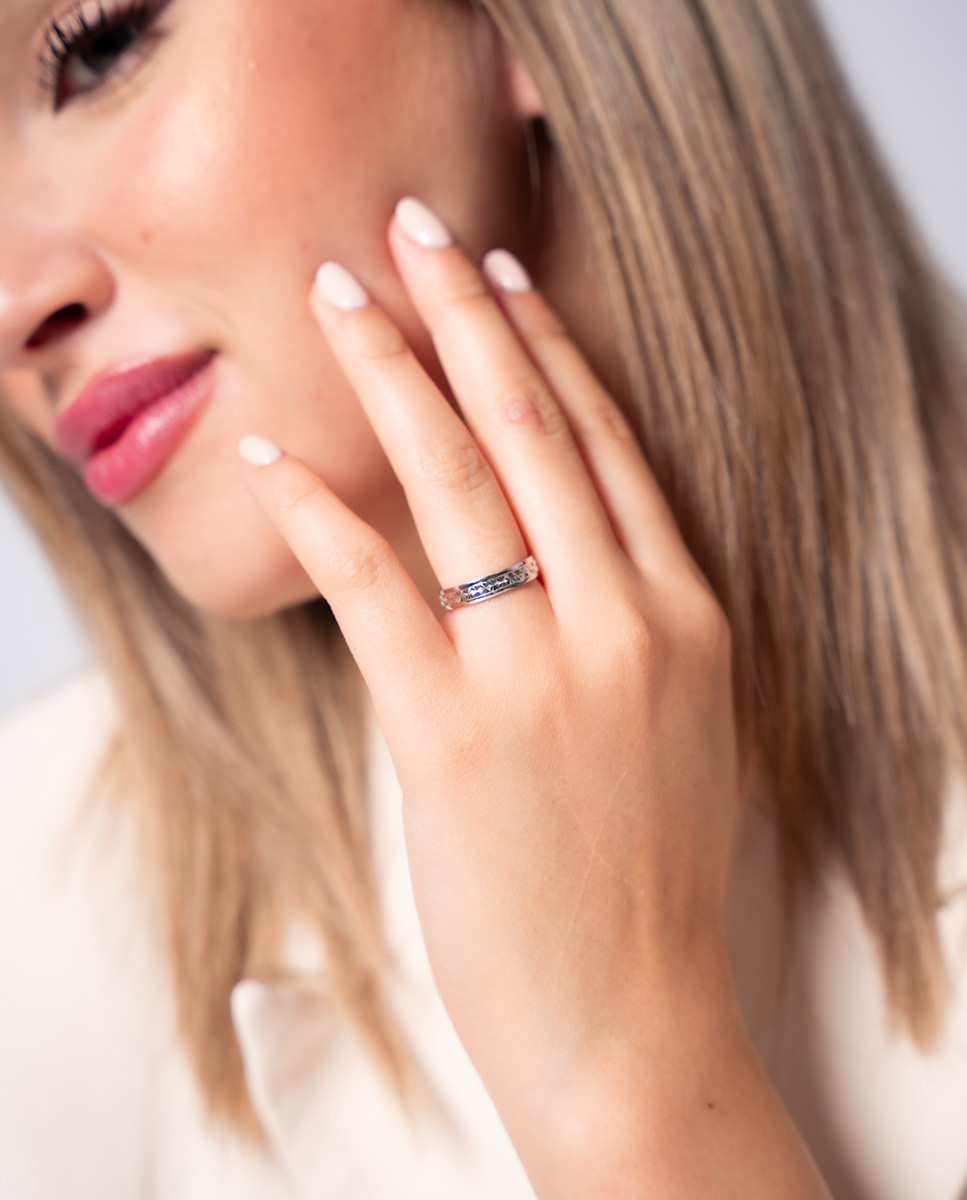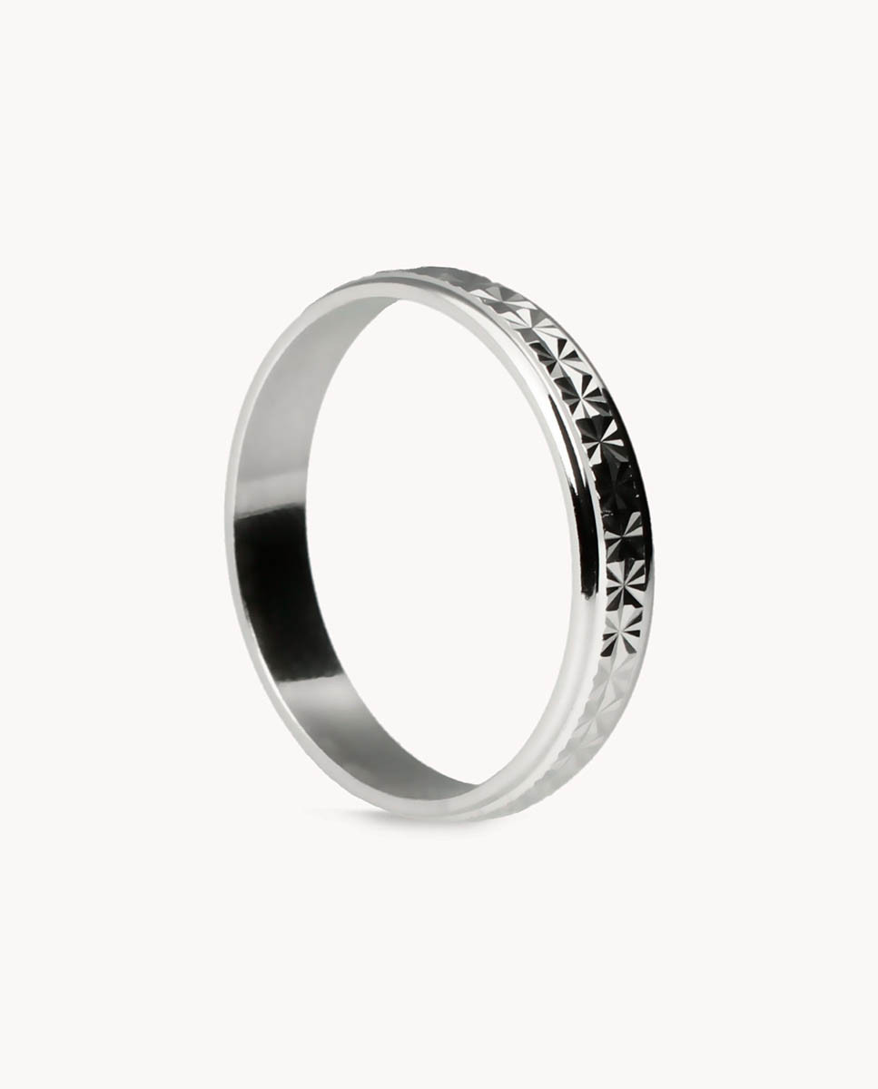Alianza de plata de ley 925 bañada en rodio de 4 mm de ancho con centro lapidado.