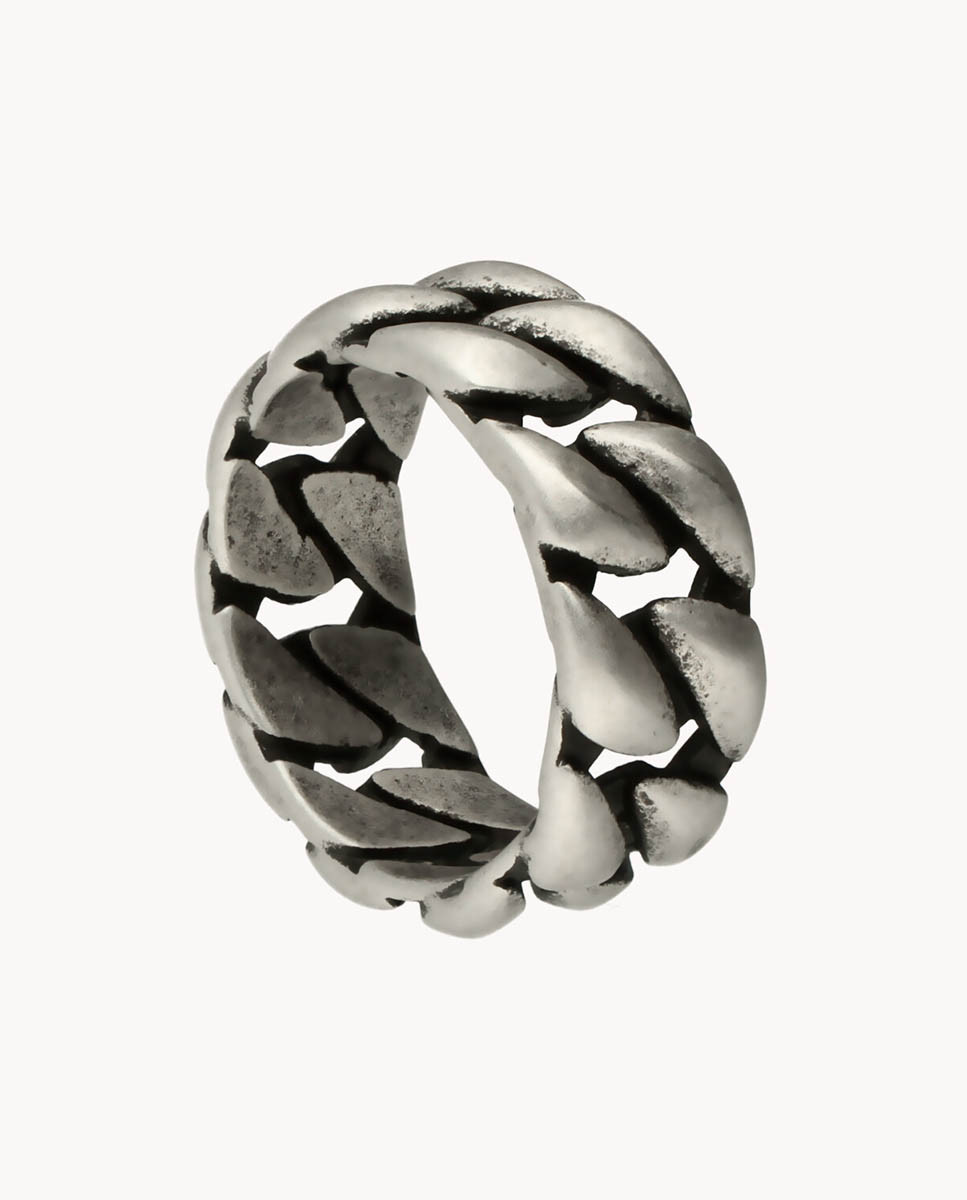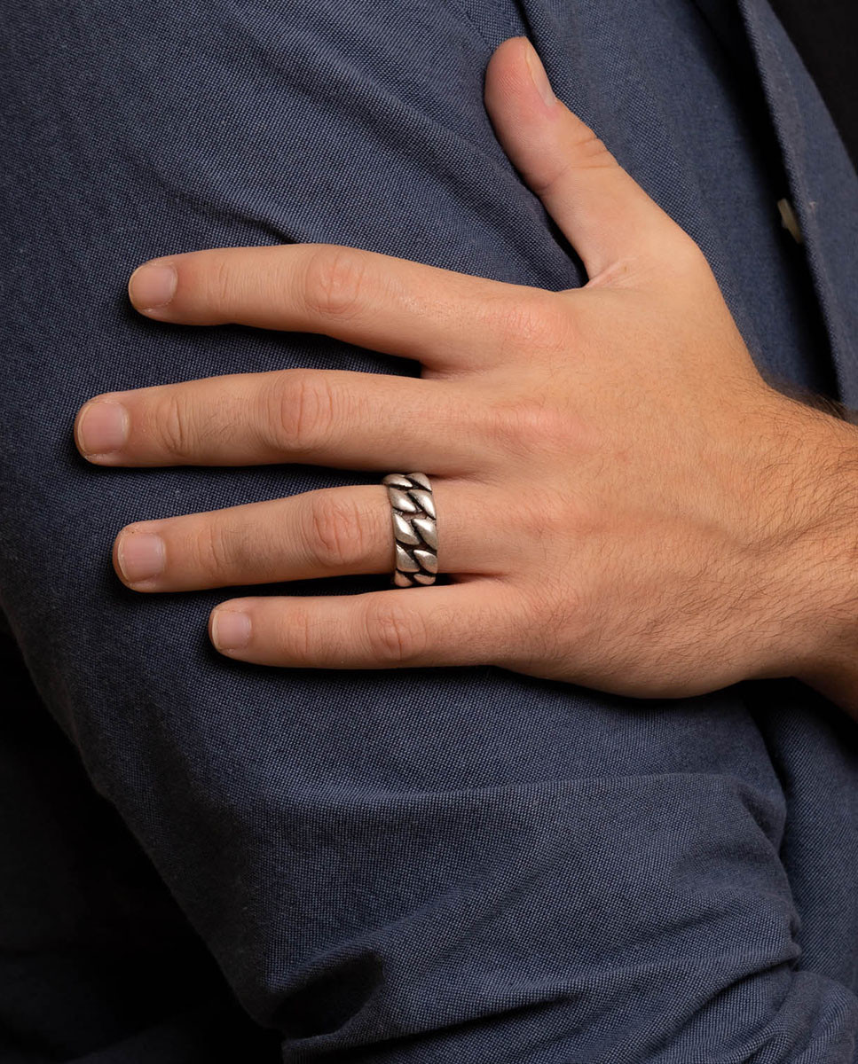 Anillo de acero inoxidable con acabado matizado y diseño barbado de 10 mm de ancho.