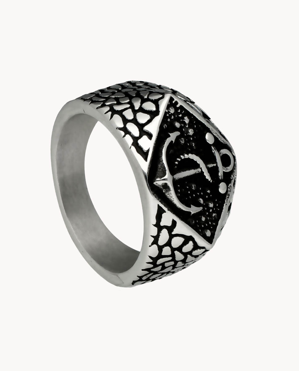 Anillo de acero inoxidable tipo sello con ancla en la parte central, ancho frontal 14 mm.