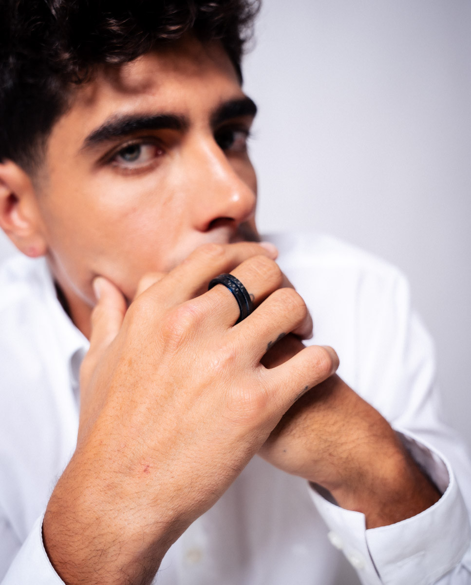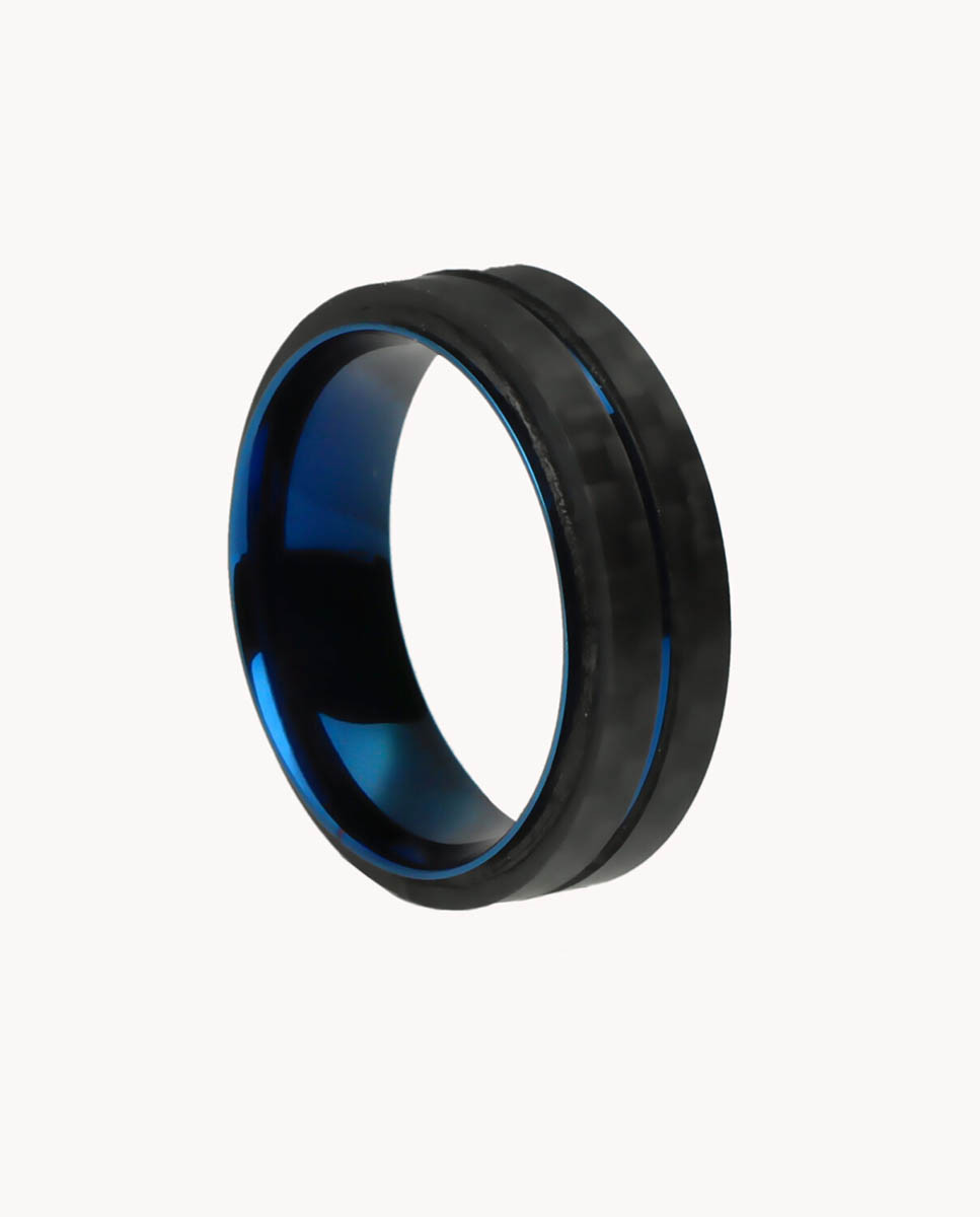 Anillo de acero inoxidable IP azul y dos líneas en ambos extremos de IP negro.
