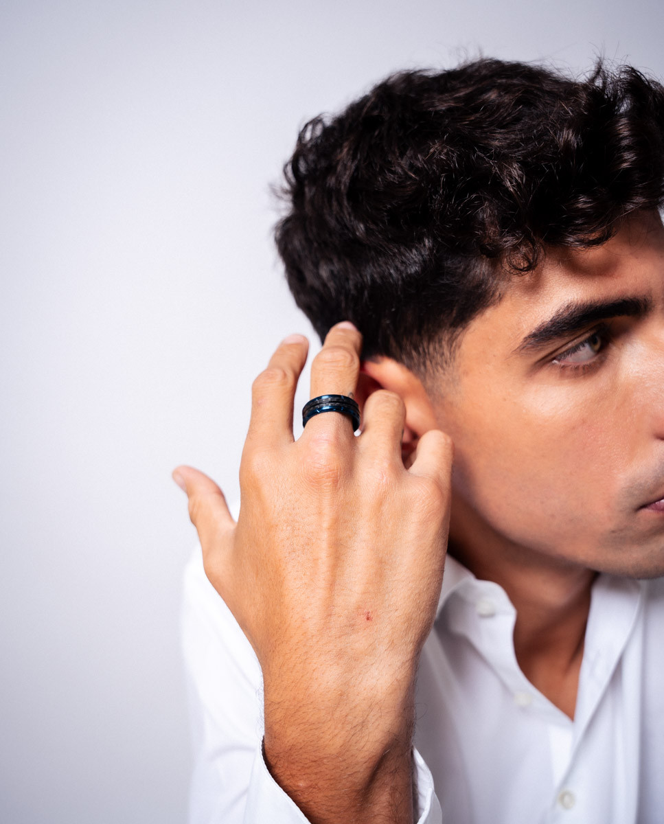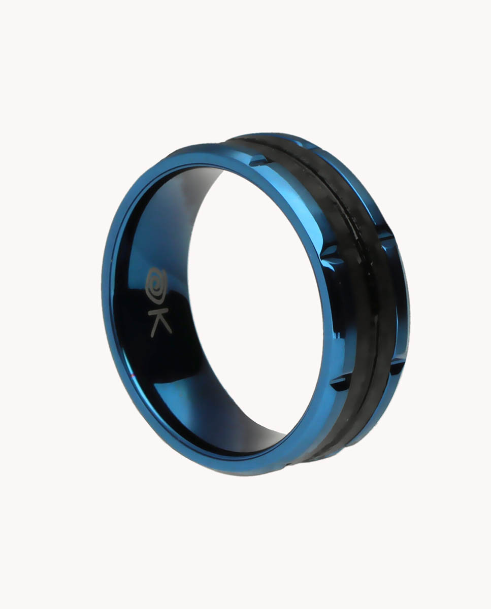 Anillo de acero inoxidable IP azul con detalles y dos líneas centrales de IP negro.