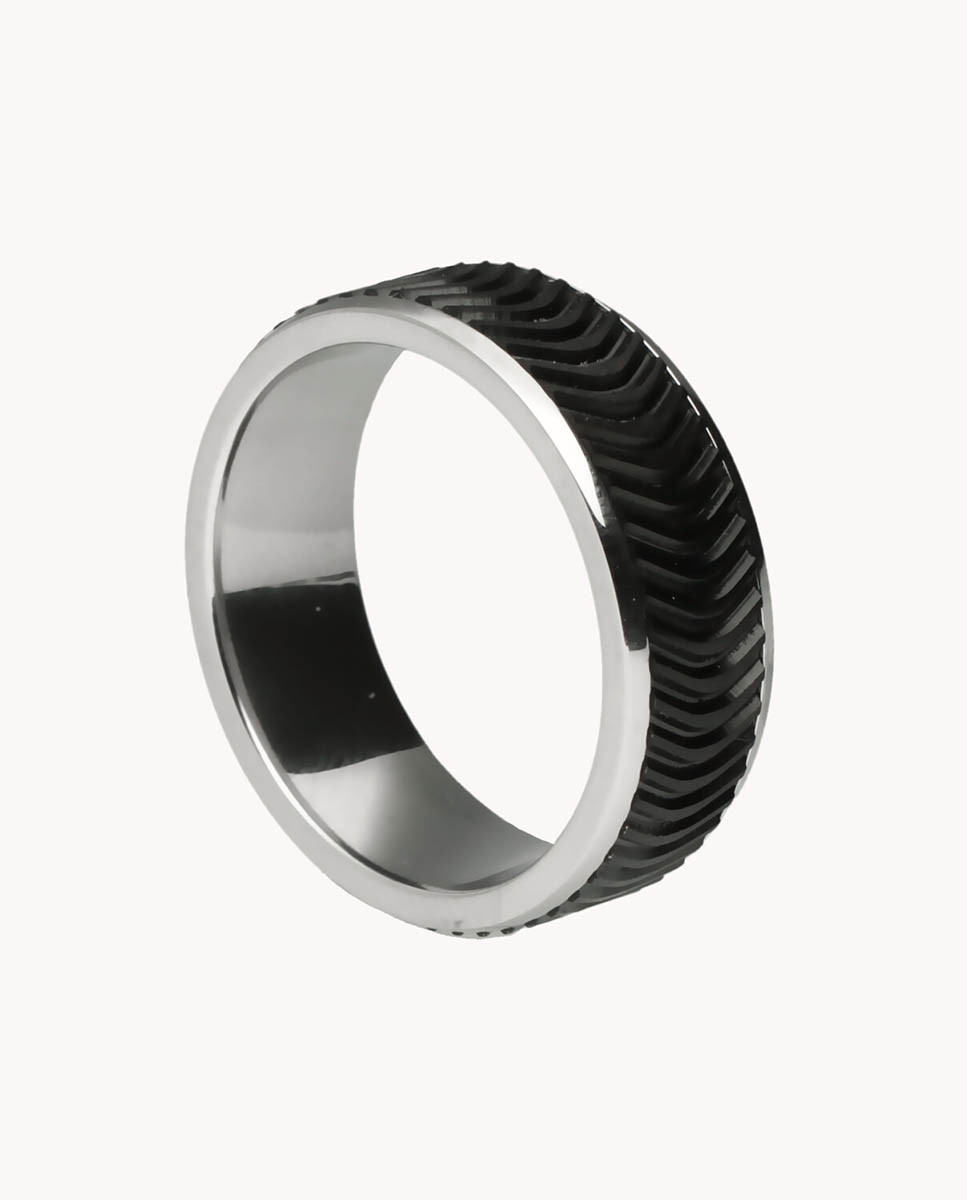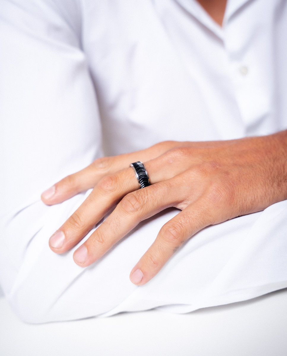 Anillo de acero inoxidable e IP negro en zona central con detalle de ondas.