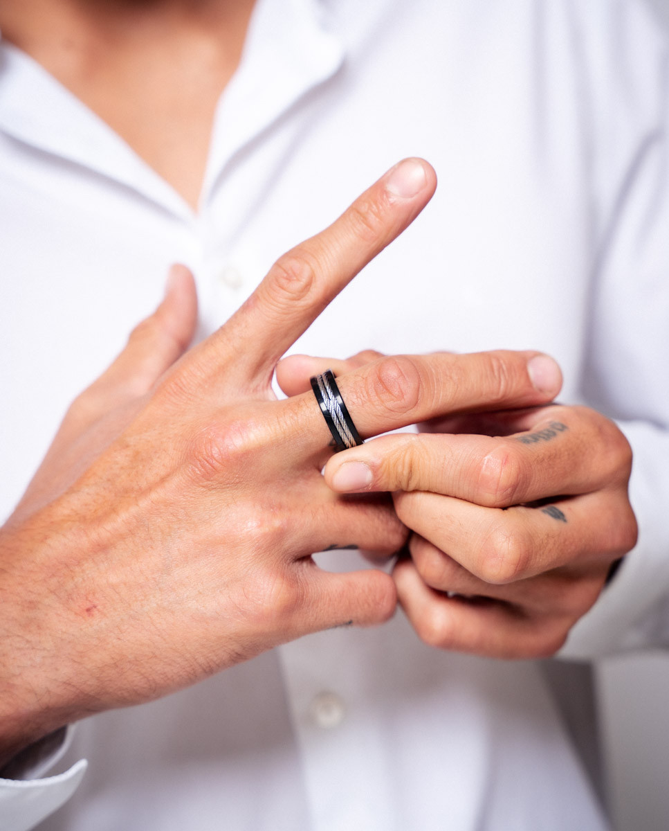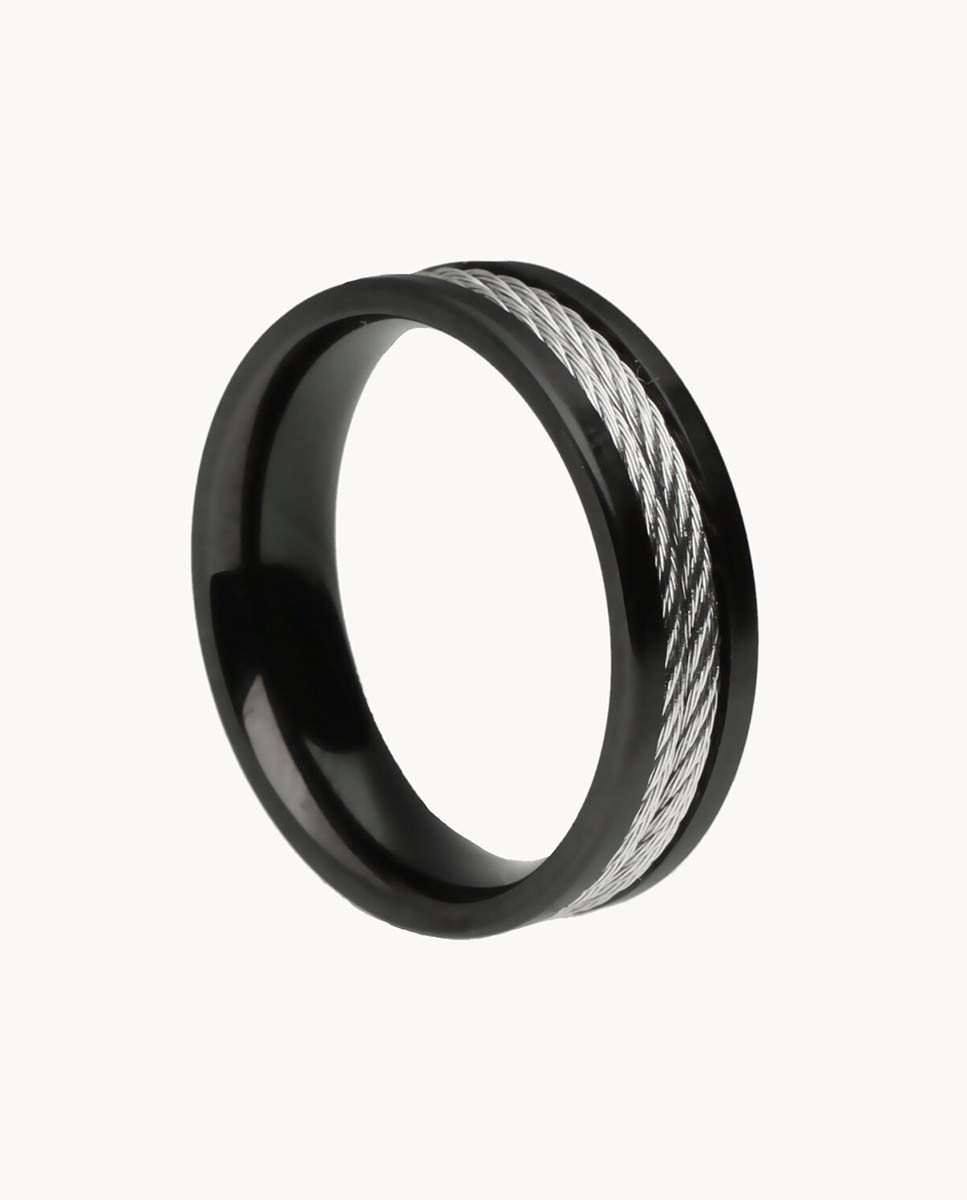 Anillo de acero inoxidable IP negro y dos hilos centrales de acero trenzado.