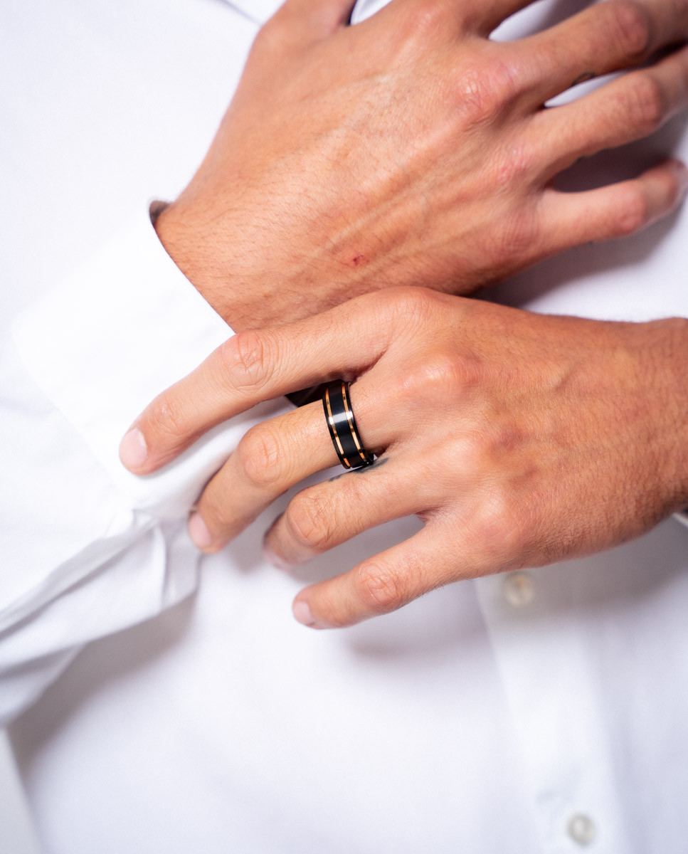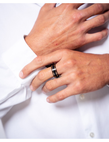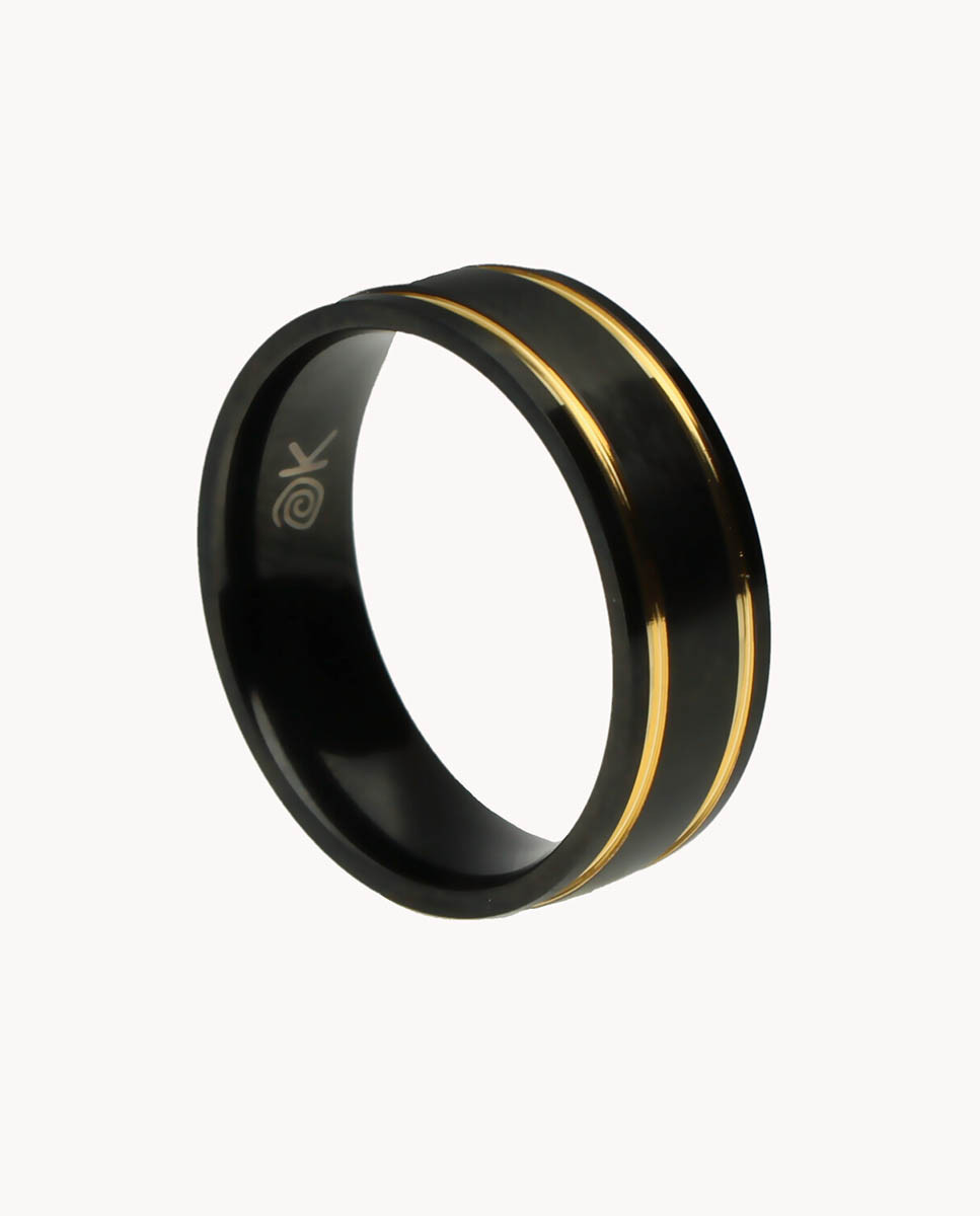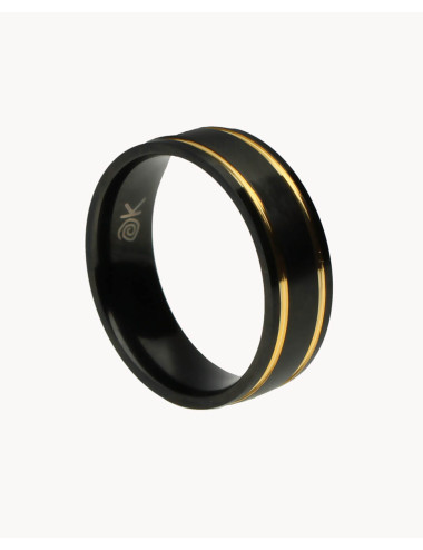 Anillo de acero inoxidable IP negro y dos líneas en los extremos IP dorado.