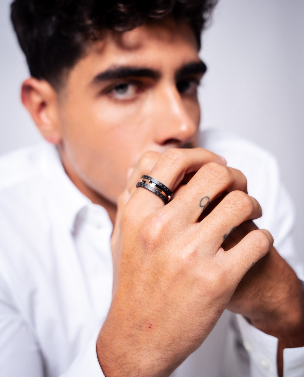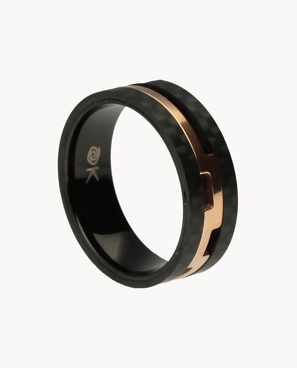 Anillo de acero inoxidable con fibra de carbono y detalle central en IP rosa.
