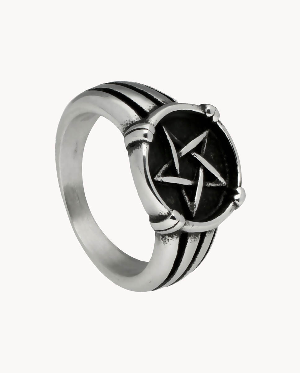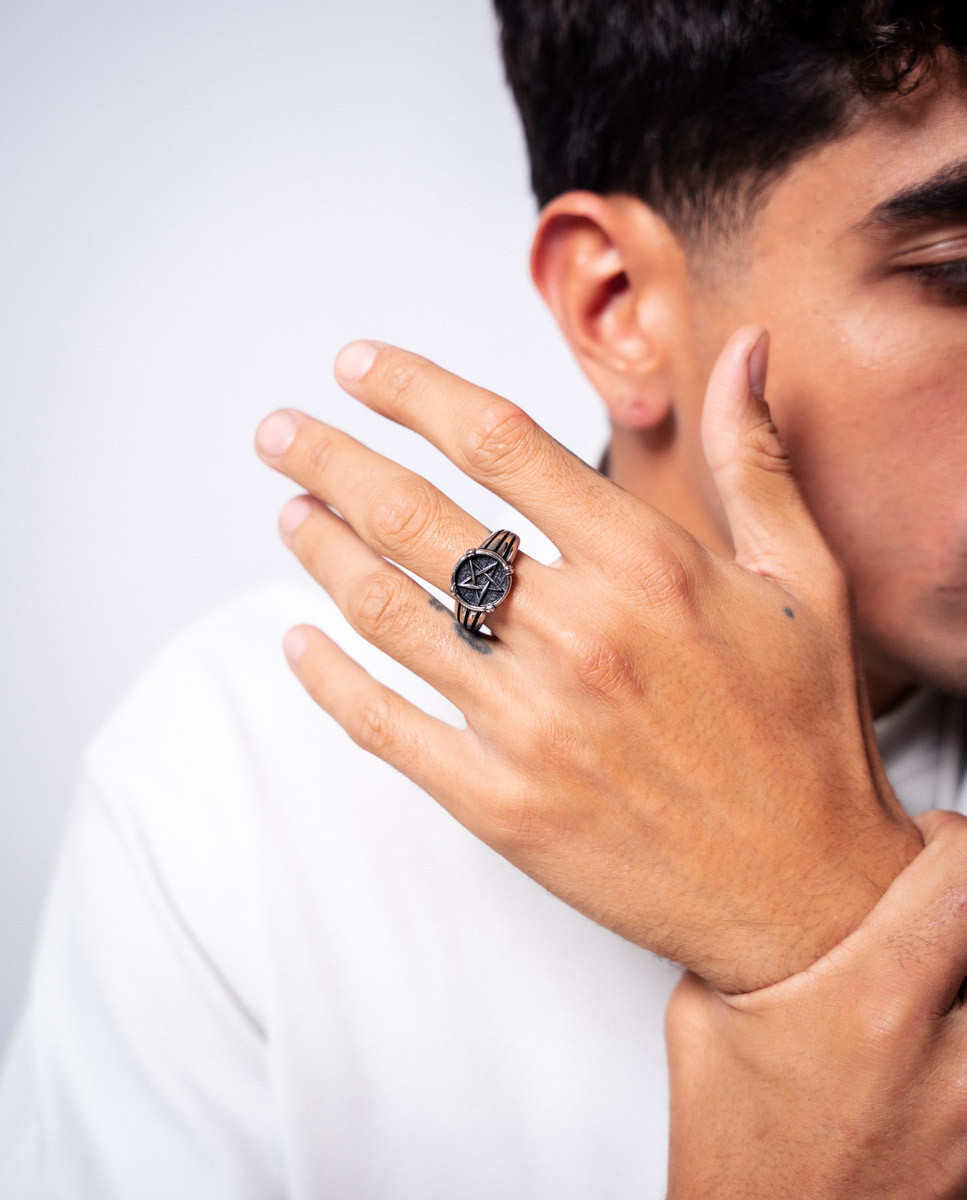 Anillo de acero inoxidable tipo sello con estrella de David en la parte central, ancho frontal 13 mm.