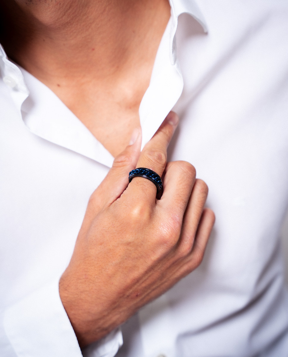 Anillo de acero inoxidable IP negro con cadena central en IP azul.