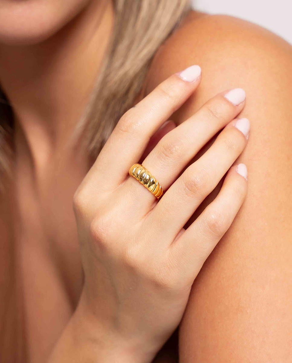 Anillo de plata de ley 925 bañada en oro 18K con diseño de líneas diagonales, 5 mm de ancho y medida ajustable (desde la talla 12 a la talla 18).