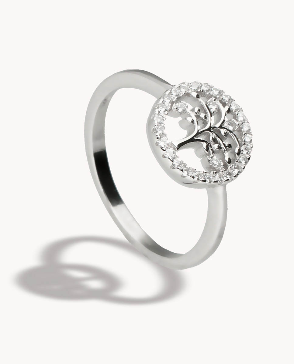 Anillo de plata de ley 925 bañada en rodio con motivo árbol de la vida y detalle de circonitas blancas.
