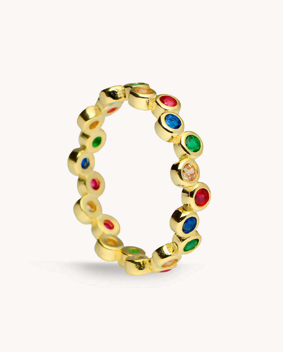 Anillo de plata de ley 925 bañada en oro con circonitas multicolor.