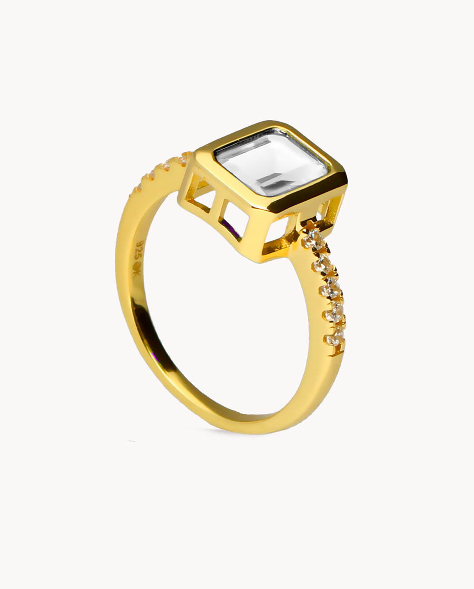 Anillo de plata de ley 925 bañada en oro 18K con circonita central blanca de 5 mm x 8 mm (ancho por alto) y carril de circonitas blancas en ambos laterales.