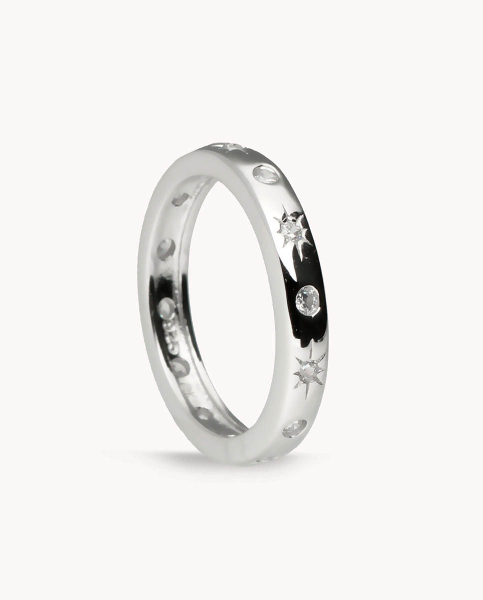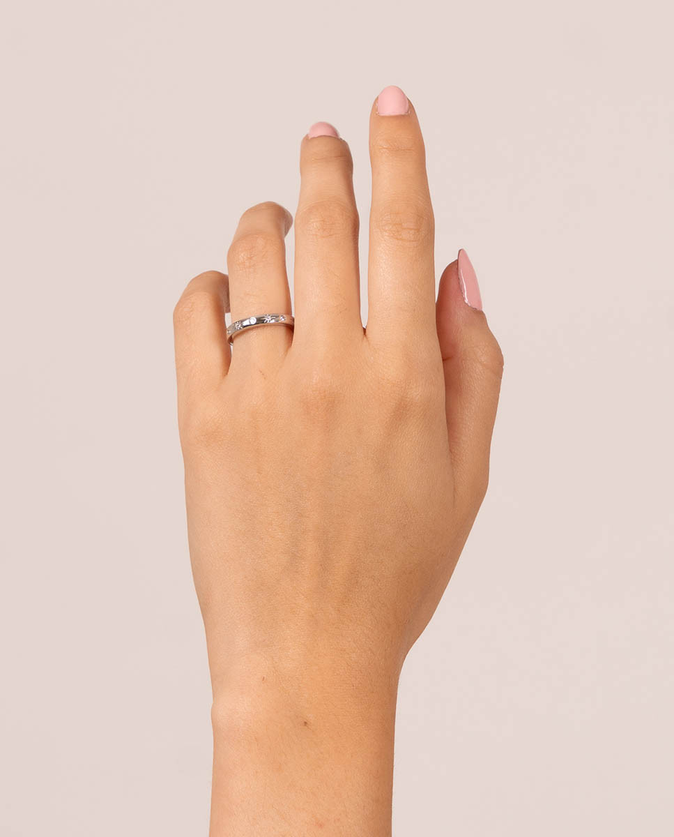 Anillo de plata de ley 925 bañada en rodio tipo alianza con circonitas blancas.