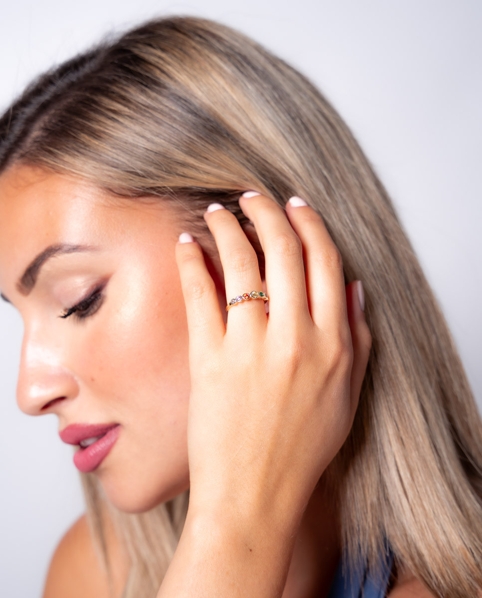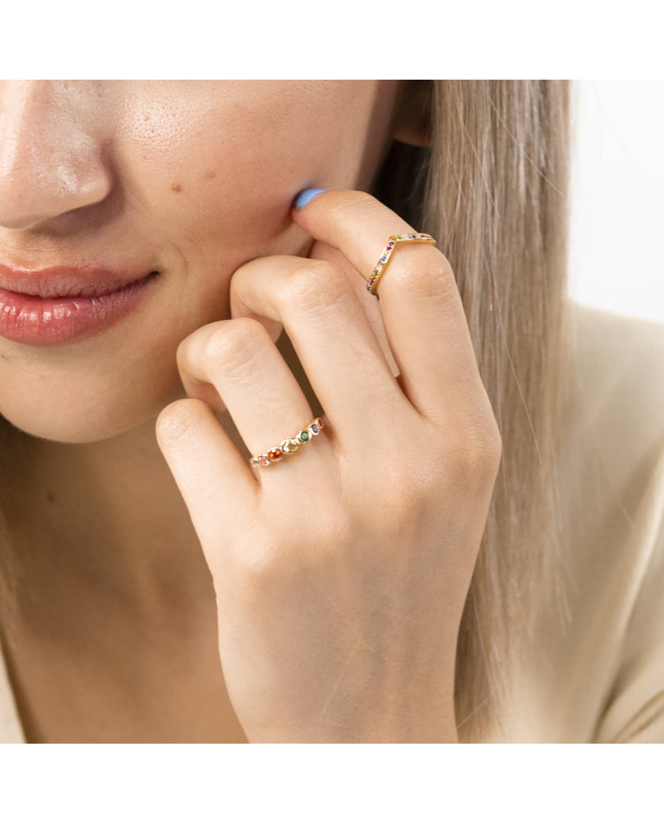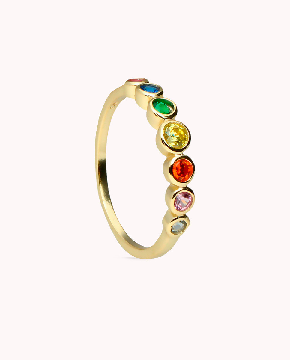 Anillo de plata de ley 925 bañado en oro tipo media alianza con circonitas multicolor.