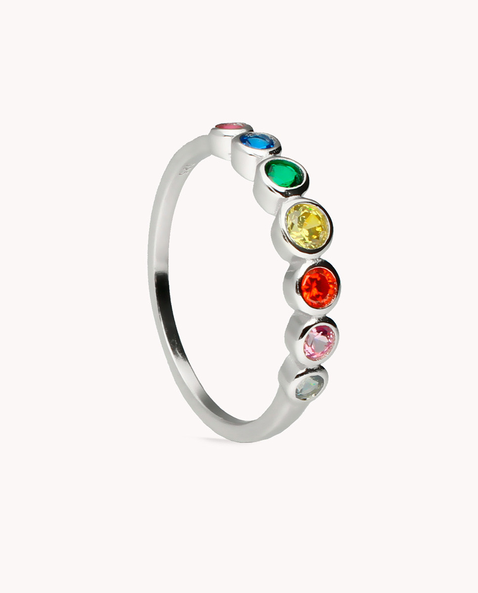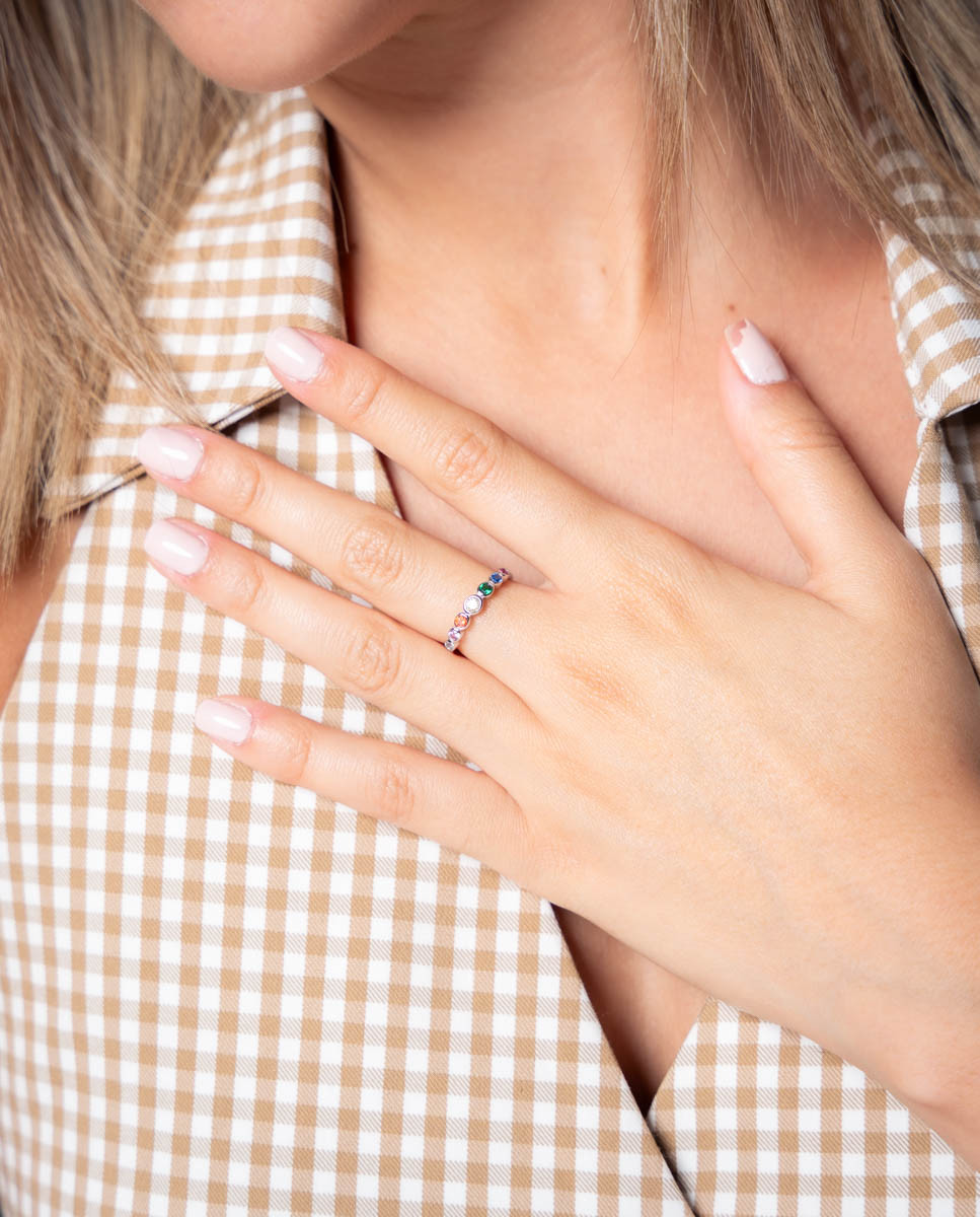 Anillo de plata de ley 925 bañado en rodio tipo media alianza con circonitas multicolor.