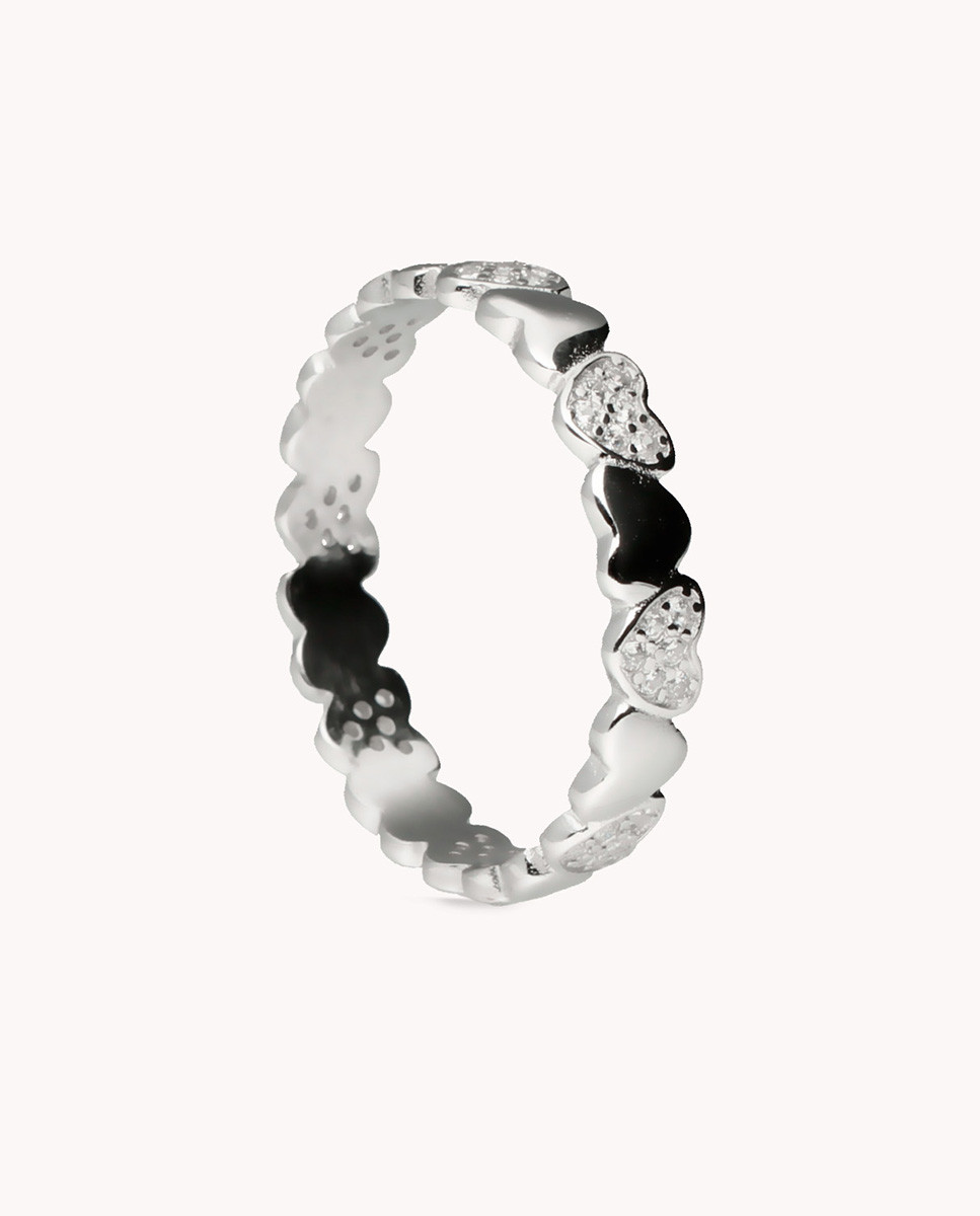 Anillo de plata de ley 925 bañada en rodio con múltiples corazones y circonitas blancas. Sencillo y elegante para llevar a diario.