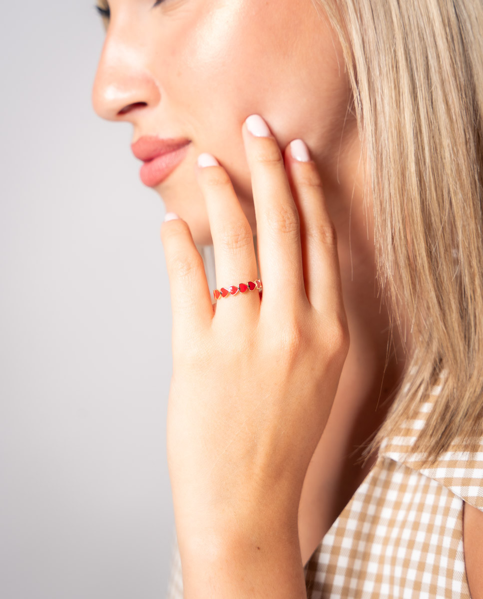 Anillo de plata de ley 925 bañado en oro con corazones esmaltados en rojo.