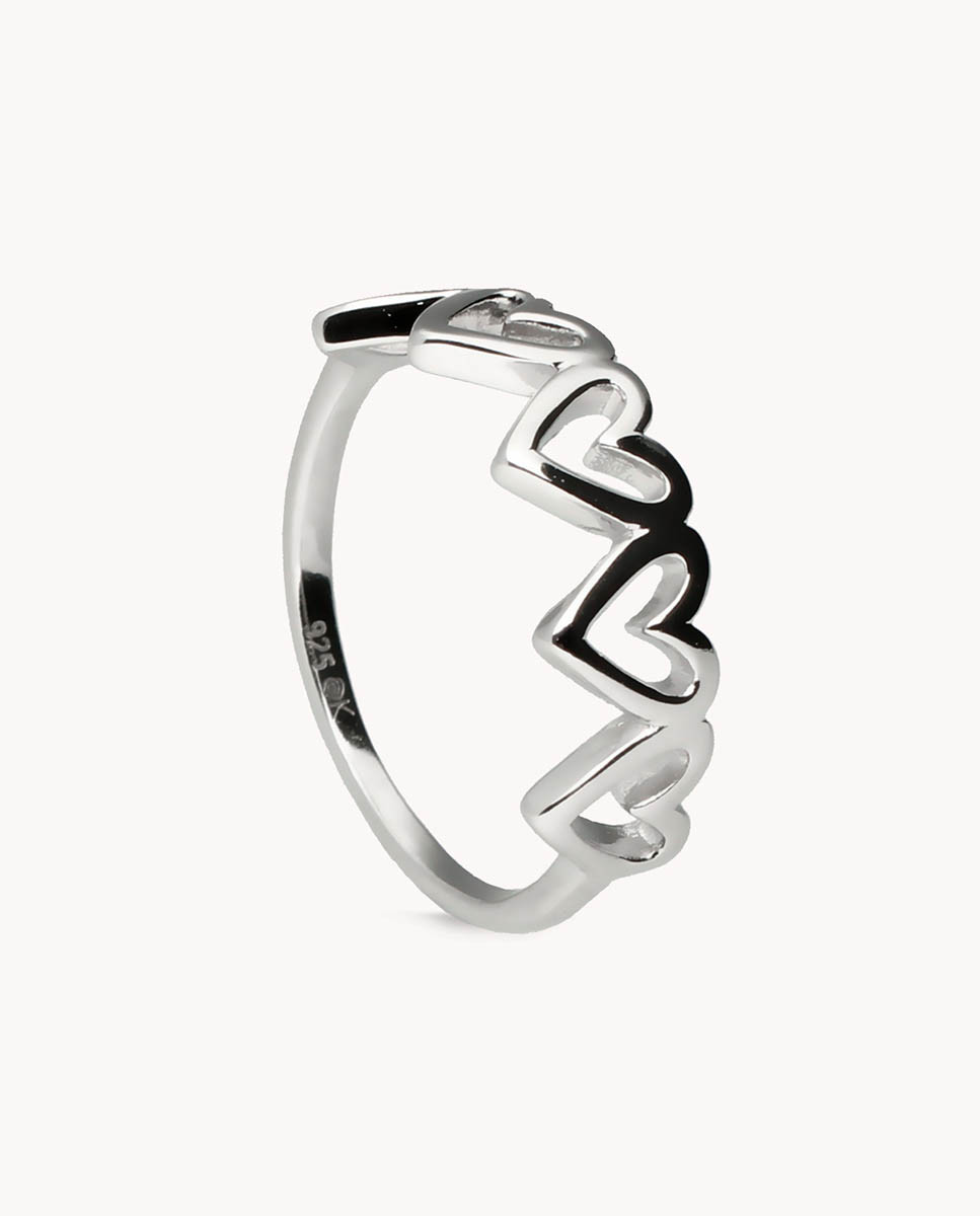 Anillo de plata de ley 925 bañada en rodio con cinco corazones en la parte frontal.