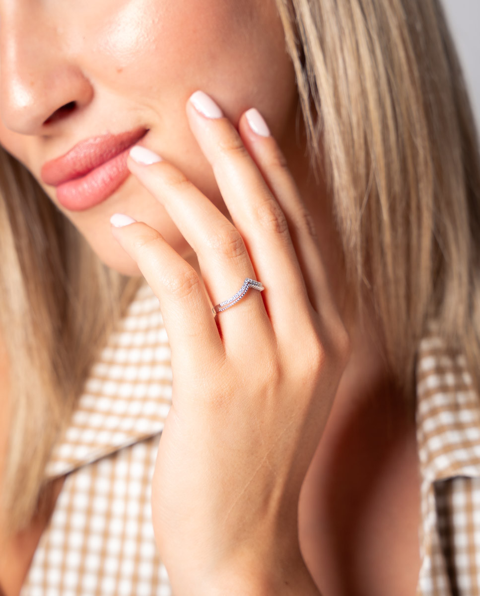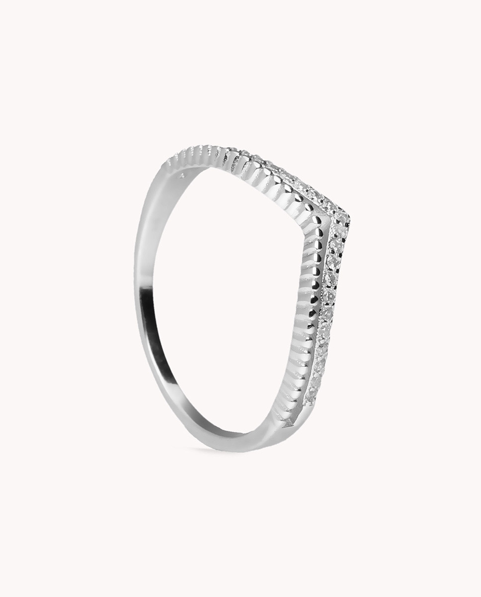 Anillo de plata de ley 925 bañada en rodio con circonitas blancas. Diseño tipo corona con doble fila.
