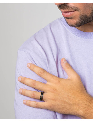 Anillo de acero inoxidable bicolor con IP negro y baño de oro rosa formando una cruz.