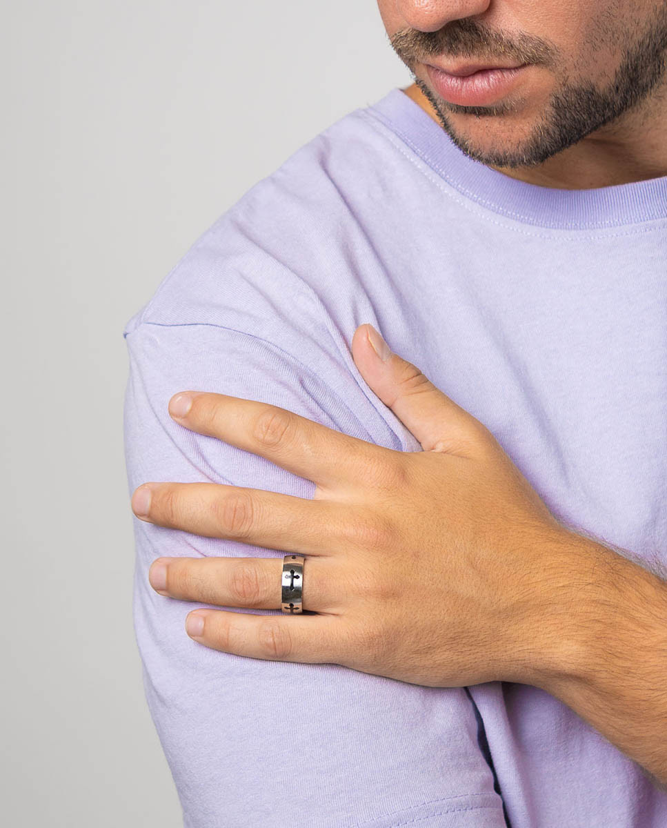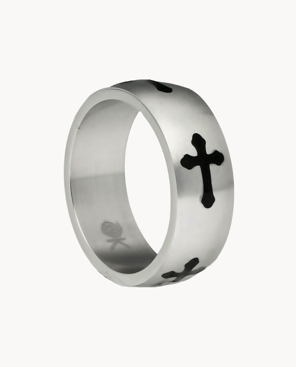 Anillo de acero inoxidable con cruces en todo el contorno.