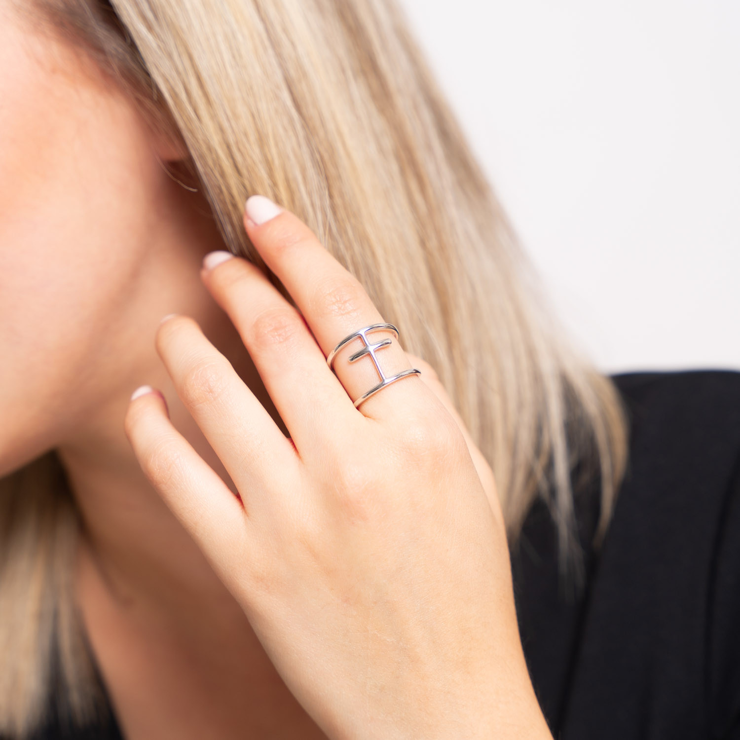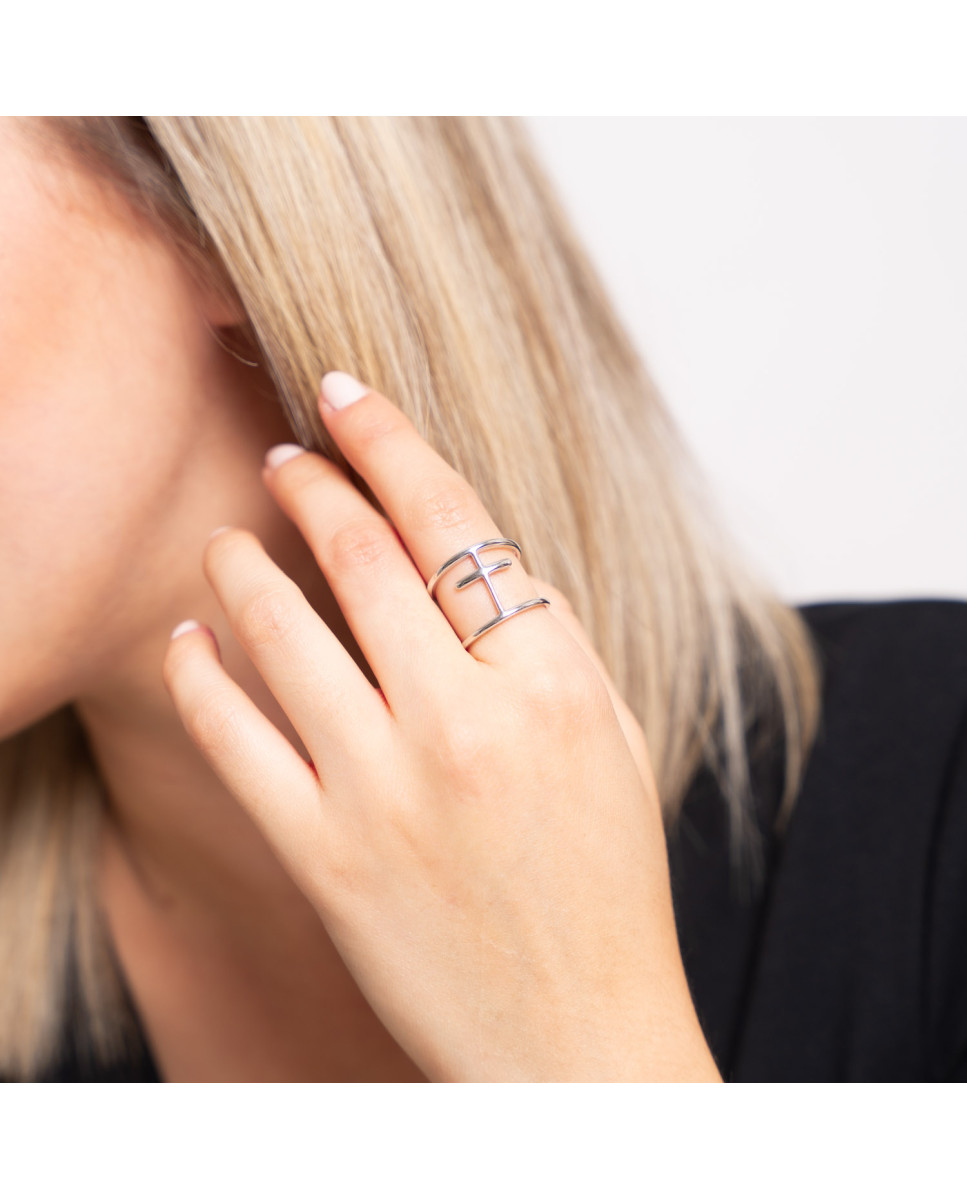 Anillo de plata de ley 925 bañado en rodio con motivo cruz.