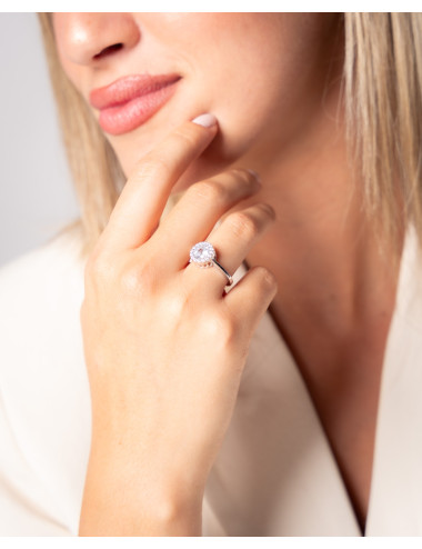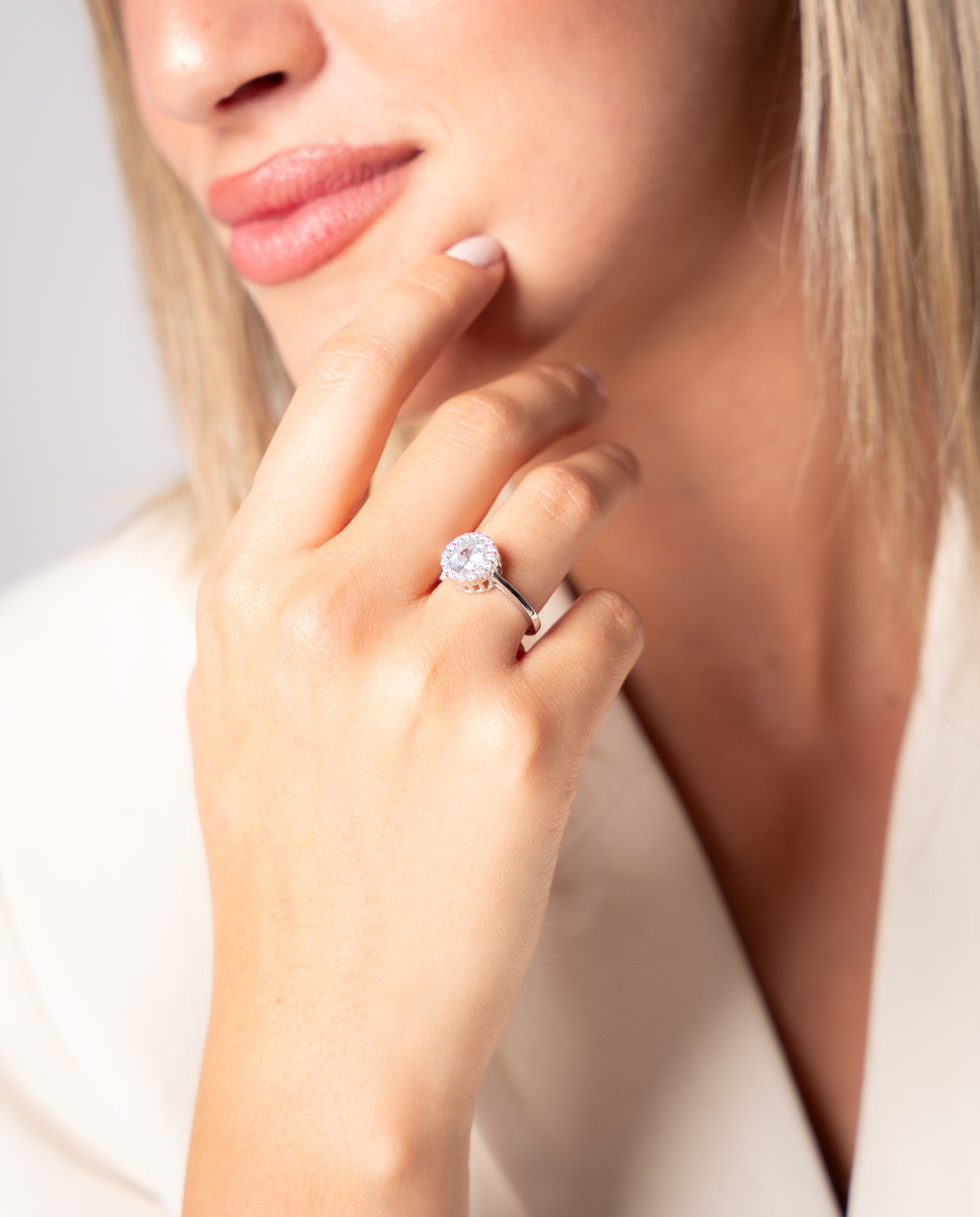 Anillo de plata de ley 925 bañado en rodio tipo solitario con circonita redonda central de 8 mm y detalle de circonitas blancas en contorno circonita central.