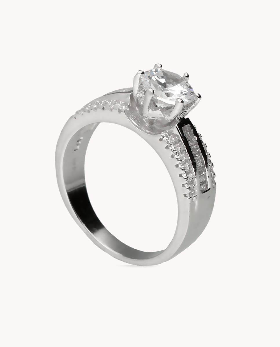 Anillo de plata de ley 925 bañado en rodio tipo solitario con circonita redonda central de 6 mm engastada en seis garras y circonitas blancas laterales combinadas con circonitas tipo baguette.