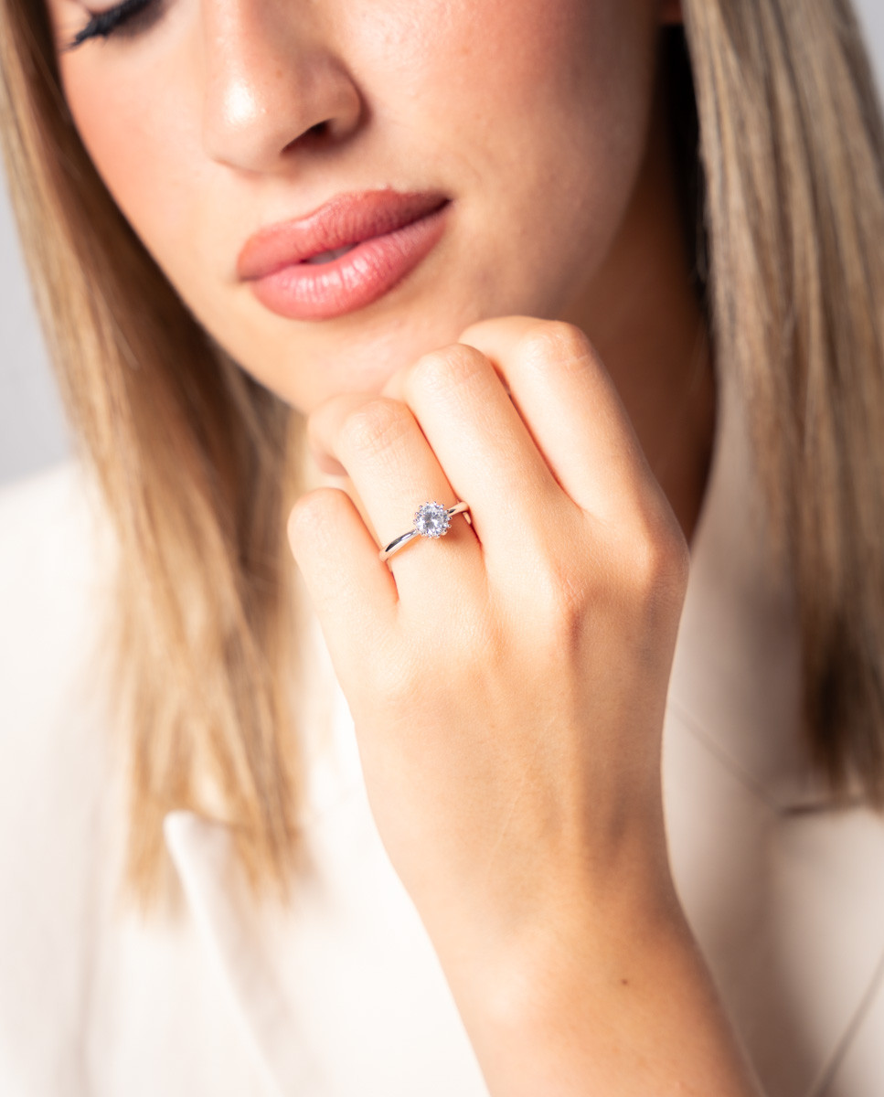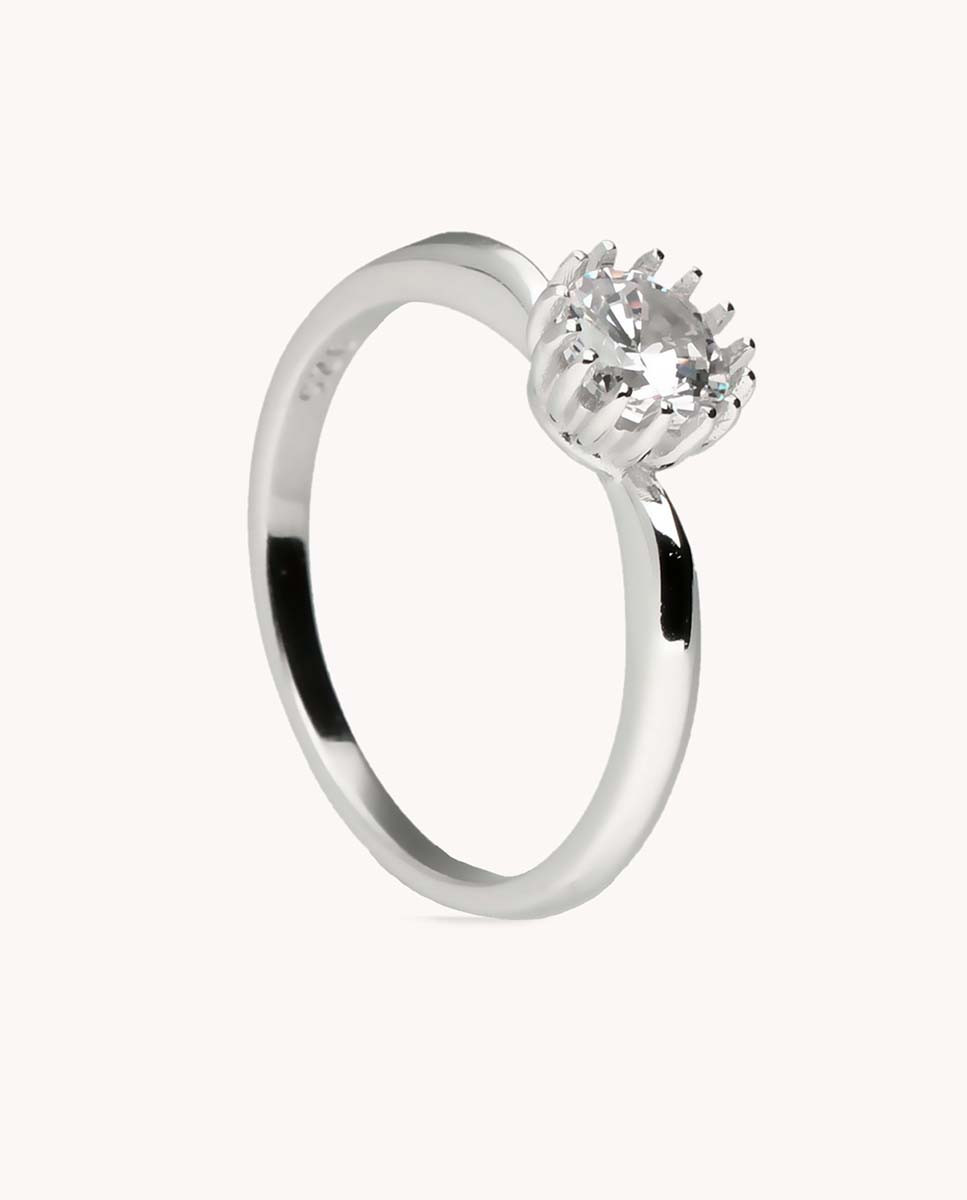 Anillo de plata de ley 925 bañado en rodio tipo solitario con circonita redonda central de 5 mm engastada en catorce garras.