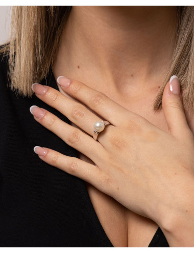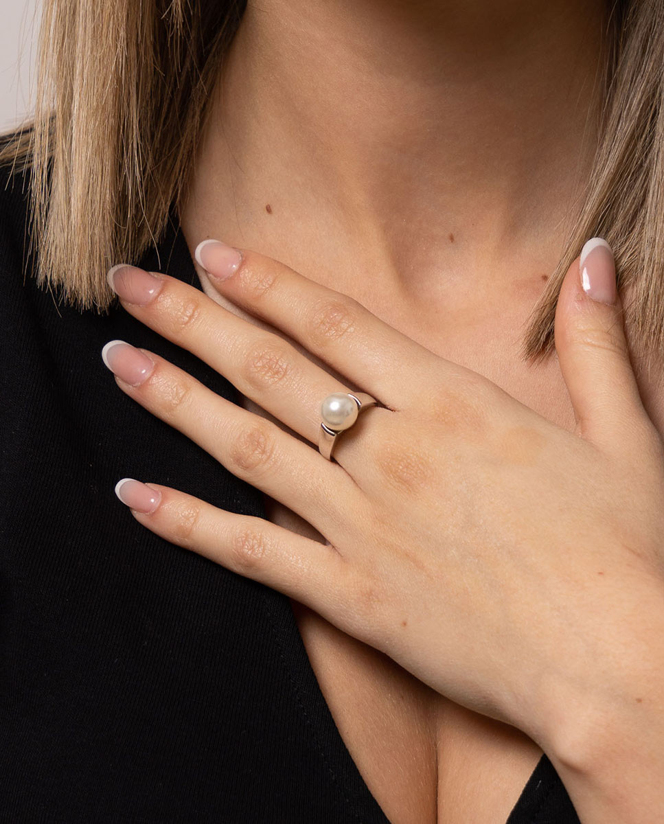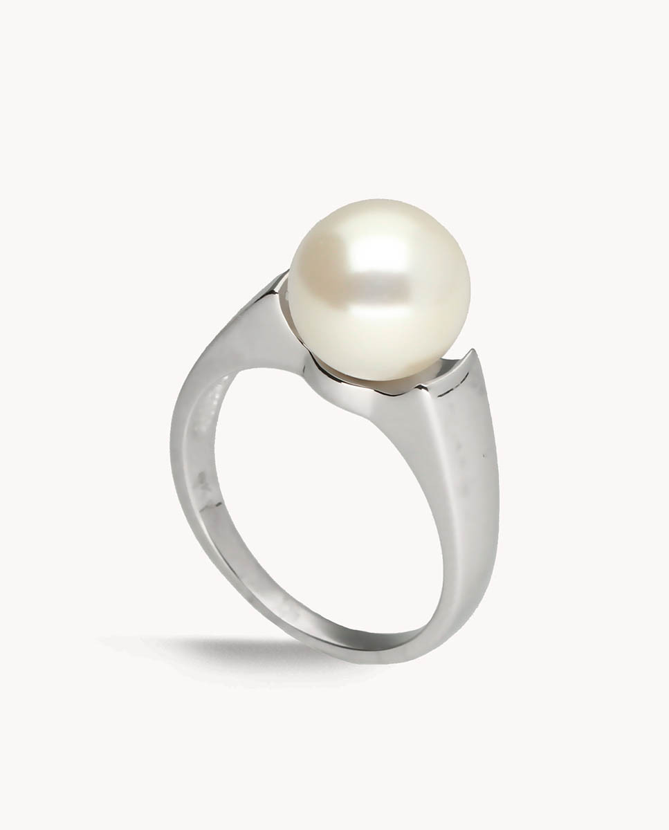 Anillo de plata de ley 925 bañado en rodio con perla cultivada de 10 mm.