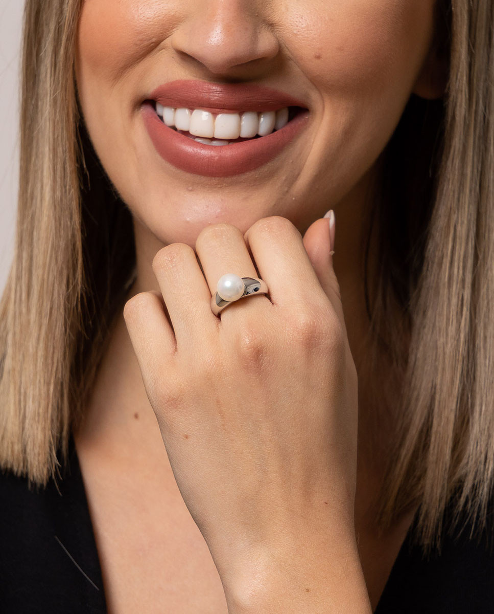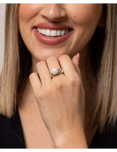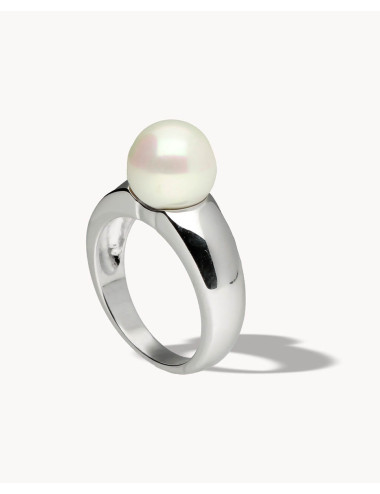 Anillo de plata de ley 925 bañado en rodio con perla cultivada de 10 mm.