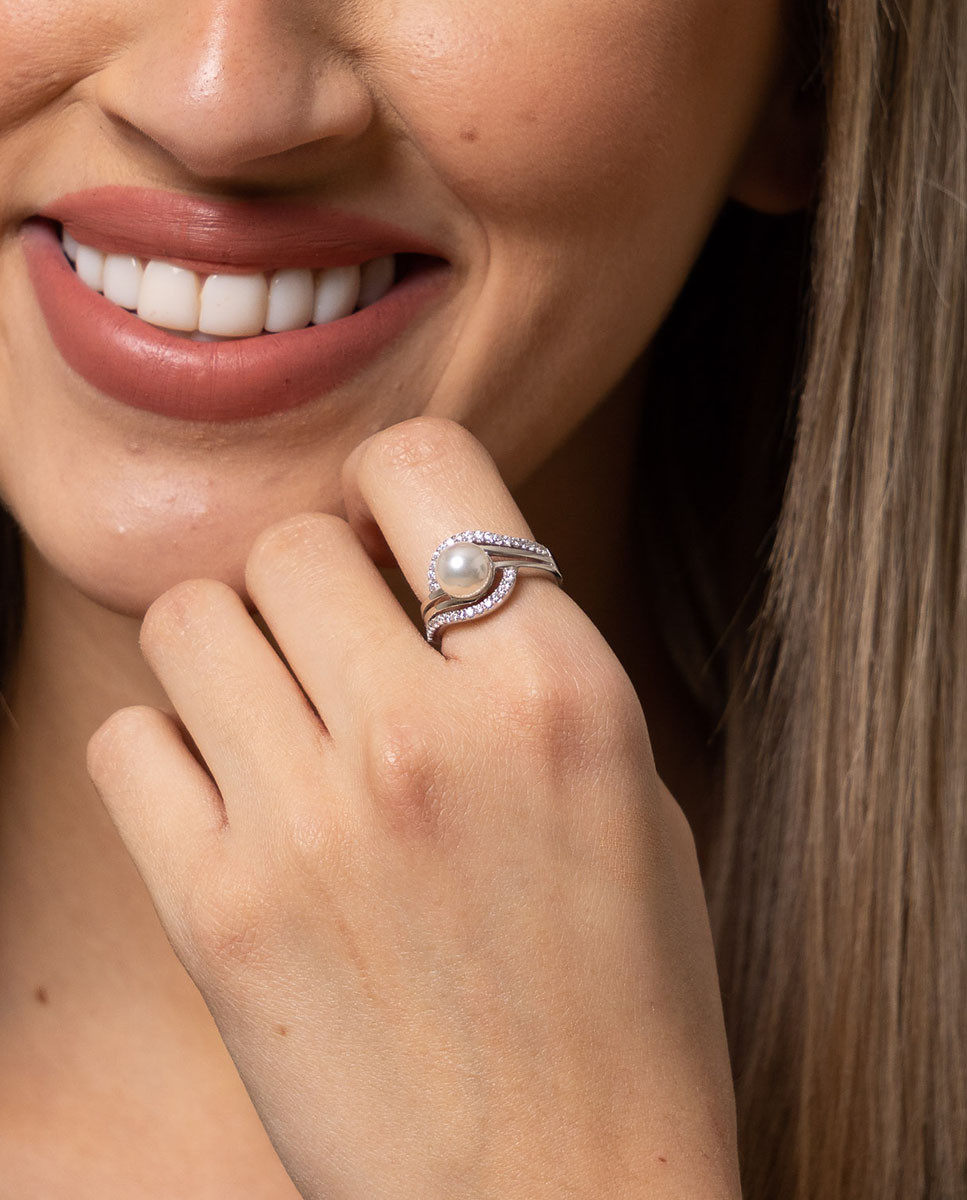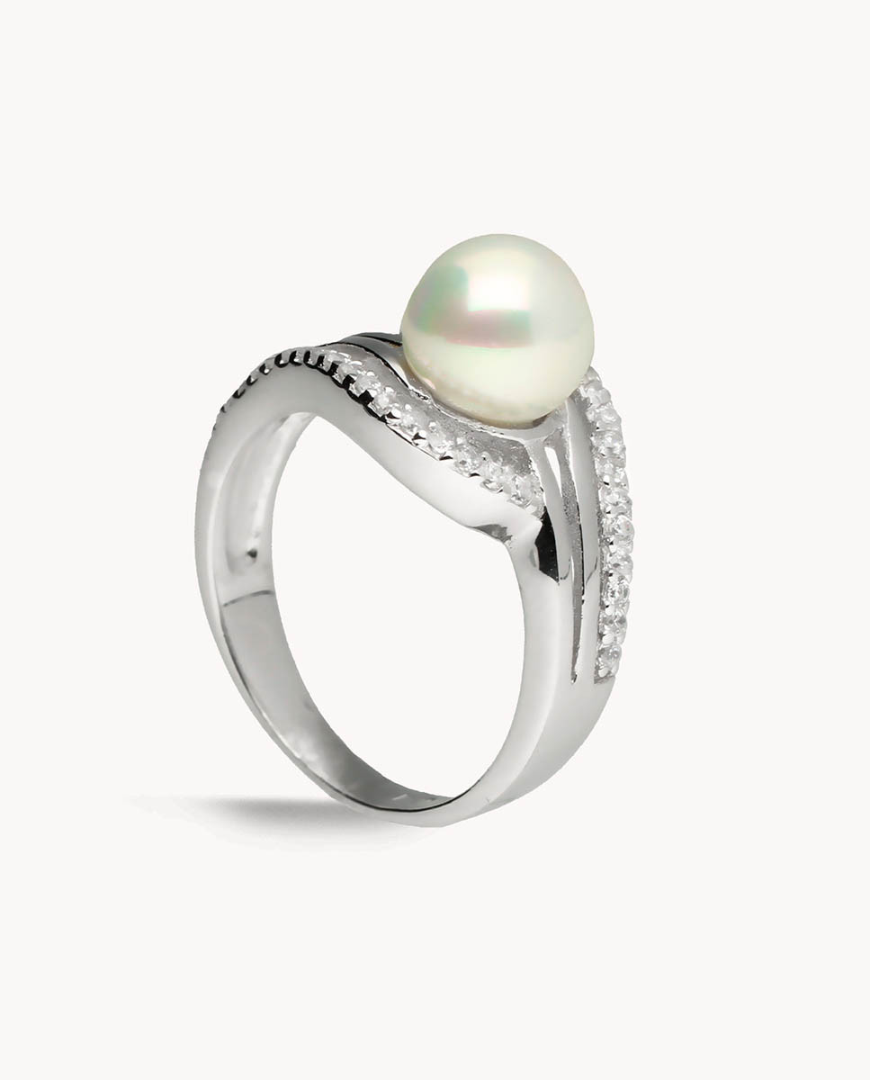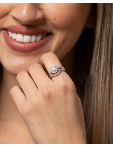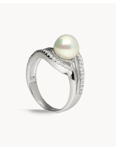 Anillo de plata de ley 925 bañado en rodio con perla de 8 mm y detalles de circonita blanca.