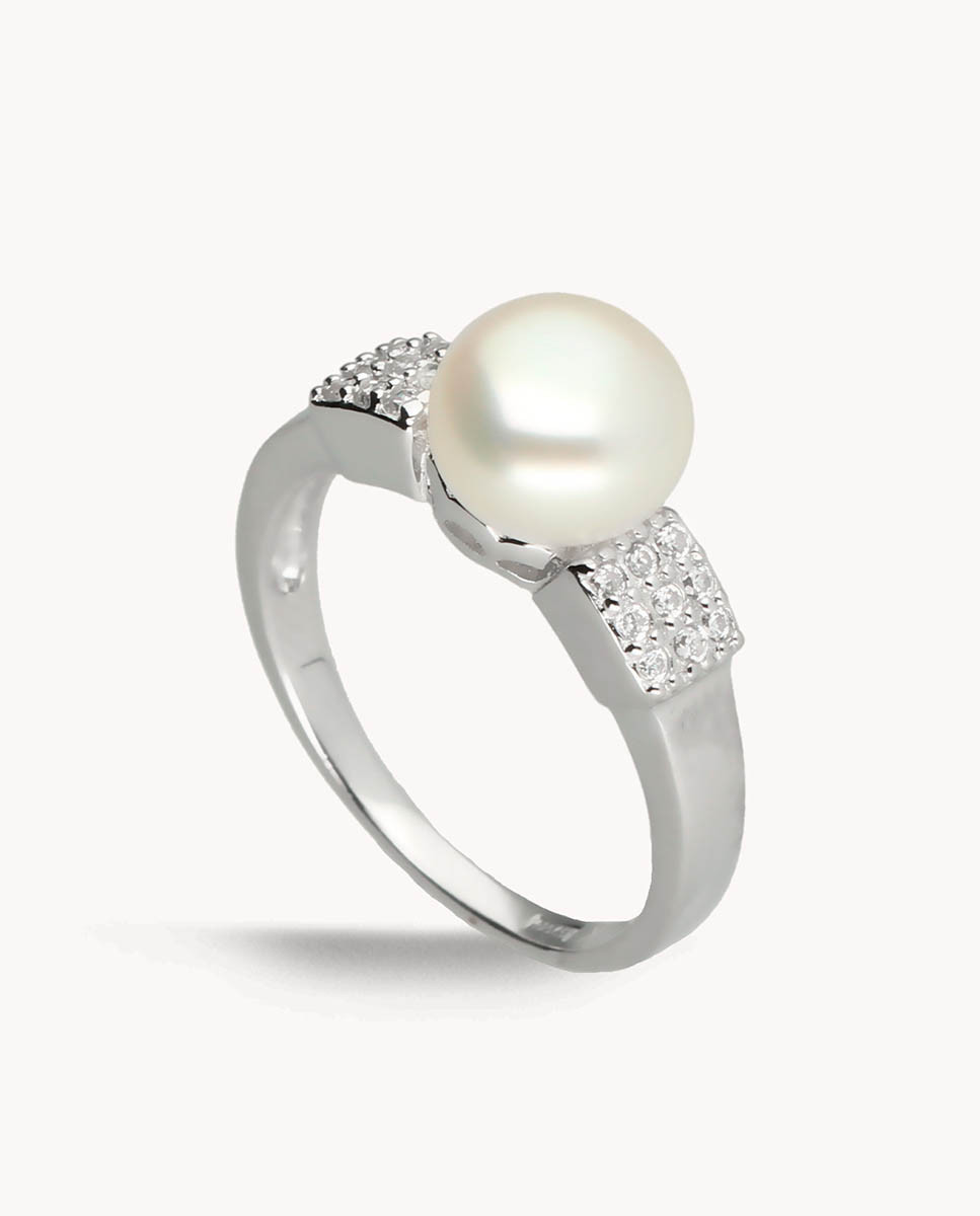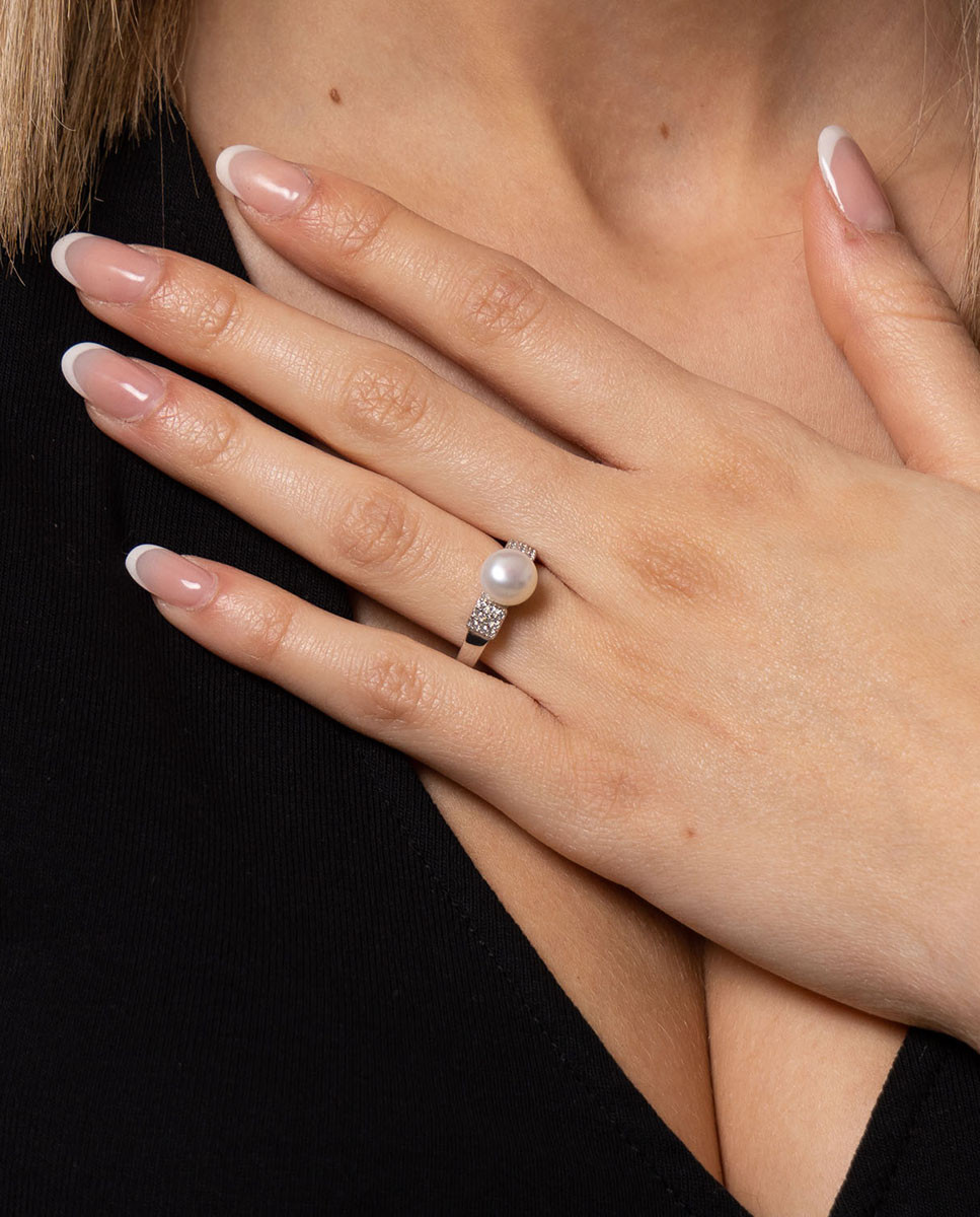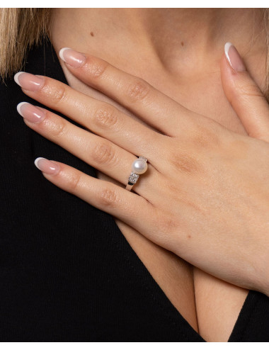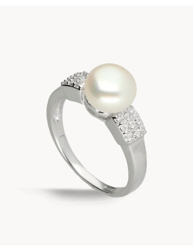 Anillo de plata de ley 925 bañado en rodio con perla cultivada de 8 mm y detalles de circonita blanca.