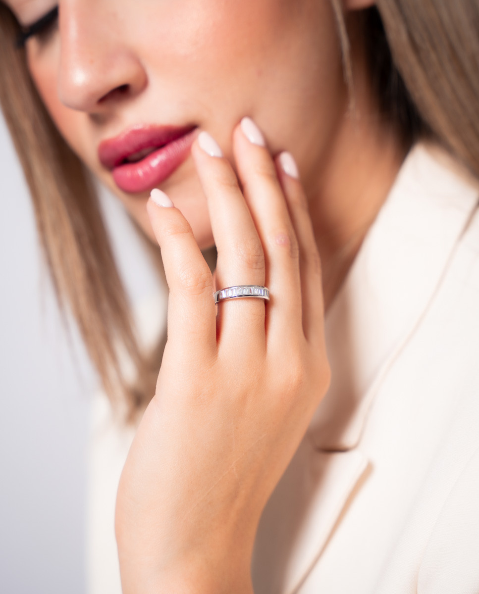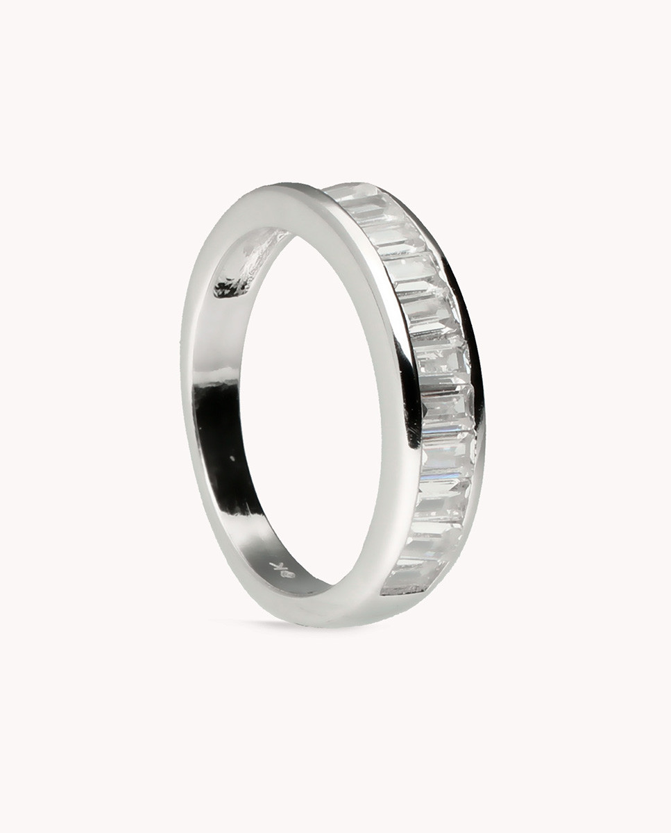 Anillo de plata de ley 925 bañada en rodio, tipo media alianza con circonitas talla baguette blancas.