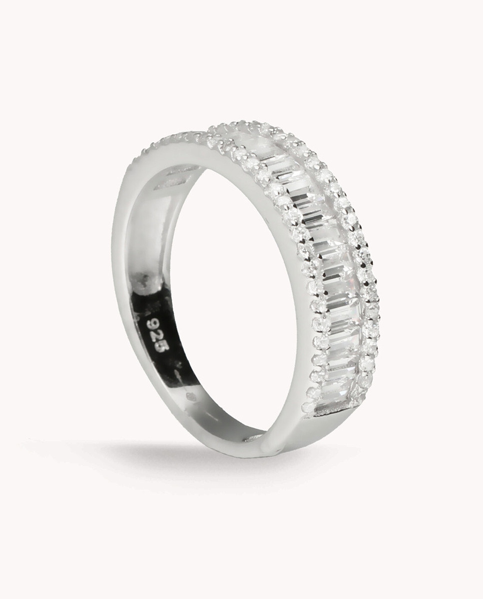 Anillo de plata de ley 925 bañado en rodio, tipo media alianza con circonitas tipo baguette blancas y en su contorno circonitas redondas blancas.