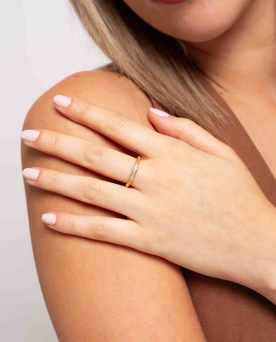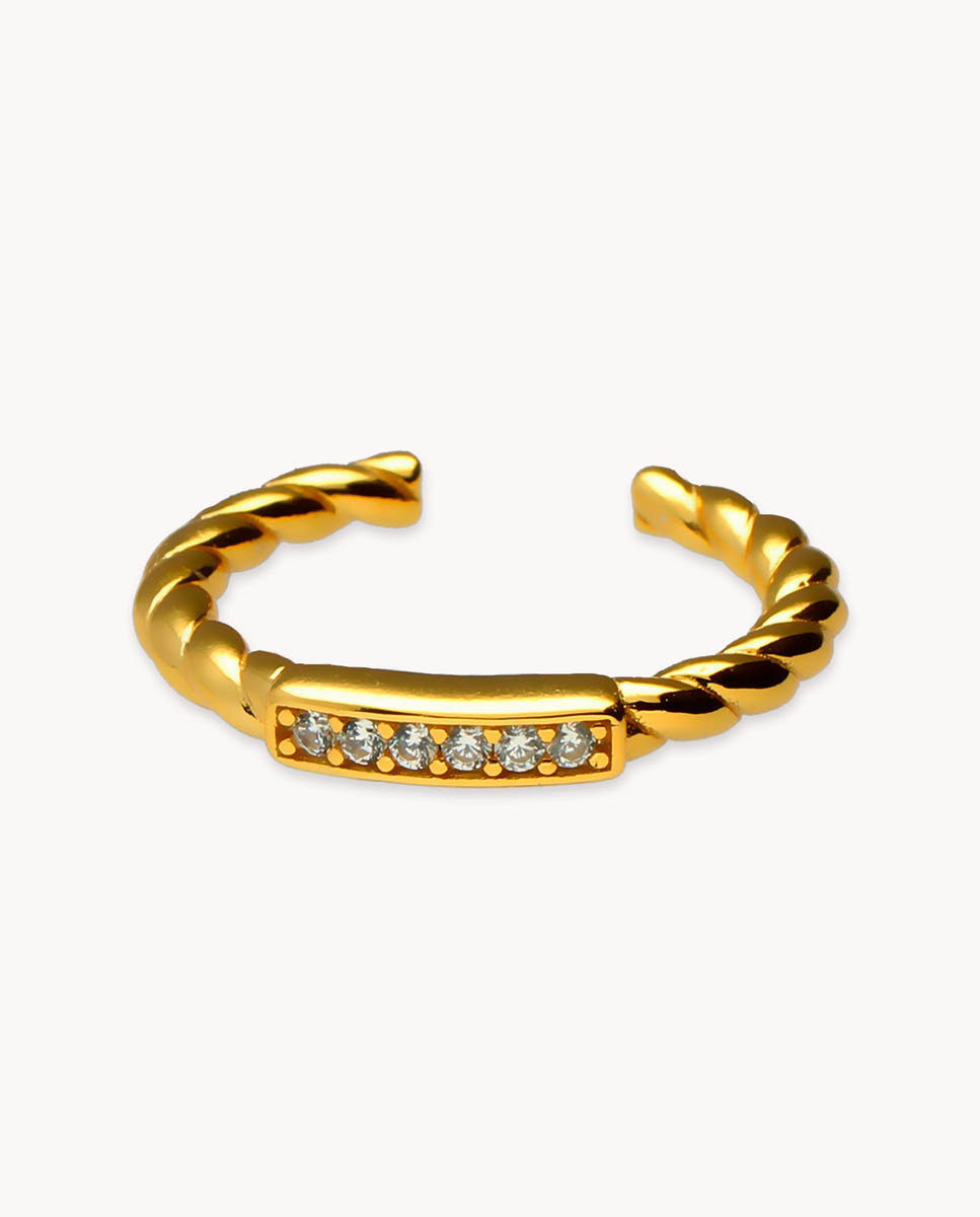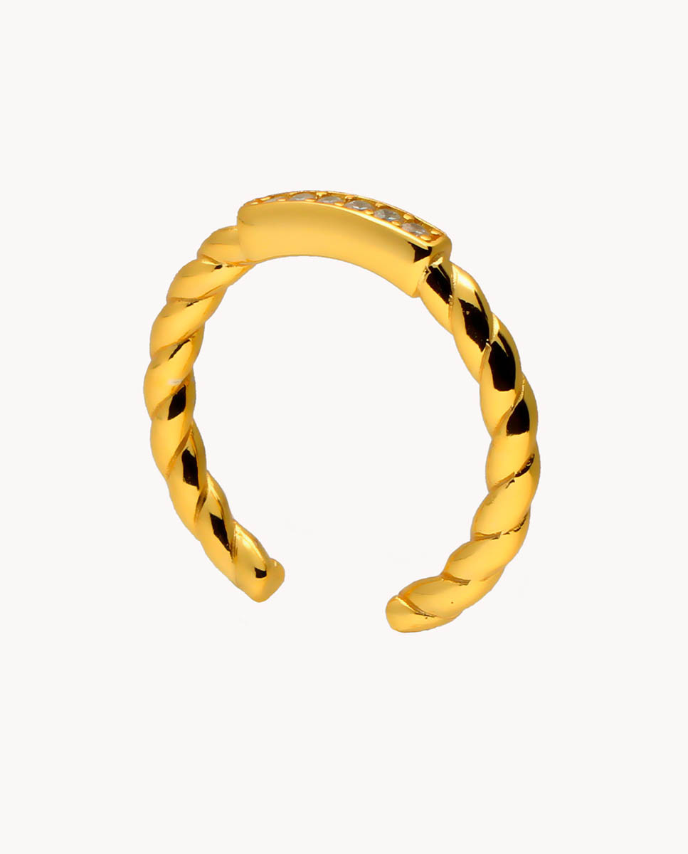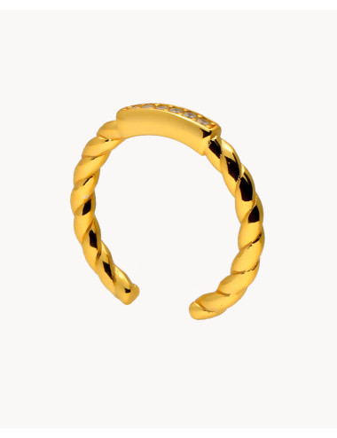 Anillo de plata de ley 925 bañada en oro 18K con diseño trenzado, placa central de 10 mm x 2 mm (ancho por alto) y circonitas blancas en su interior, medida ajustable (desde la talla 12 a la talla 18).