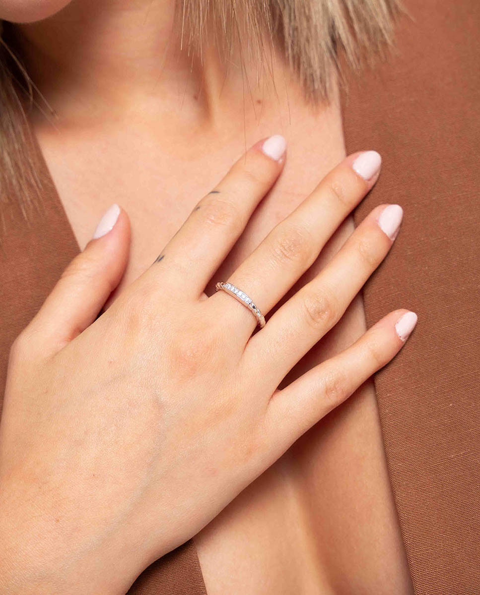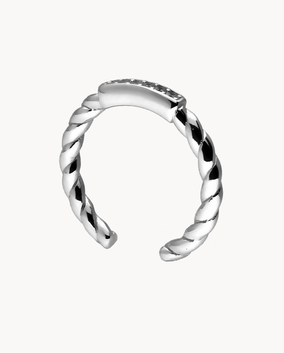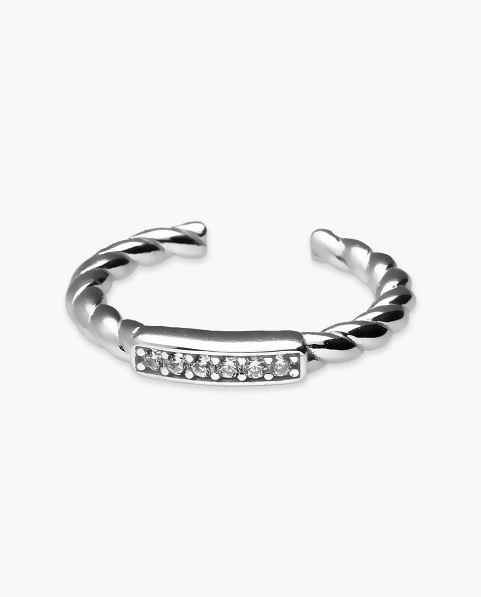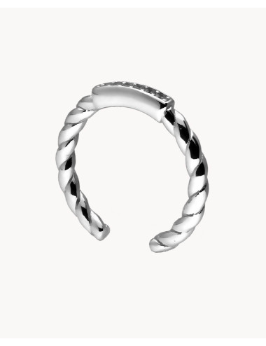 Anillo de plata de ley 925 bañada en rodio con diseño trenzado, placa central de 10 mm x 2 mm (ancho por alto) y circonitas blancas en su interior, medida ajustable (desde la talla 12 a la talla 18).