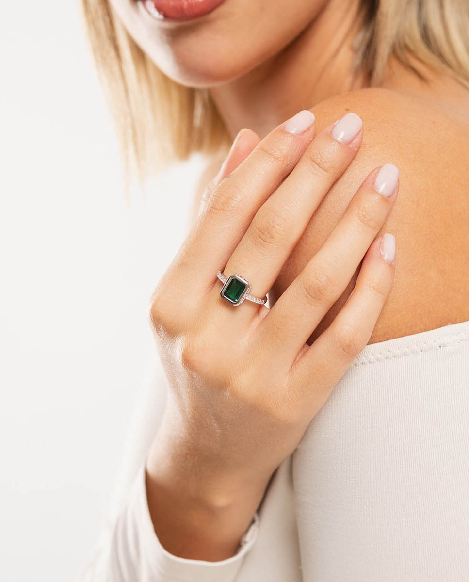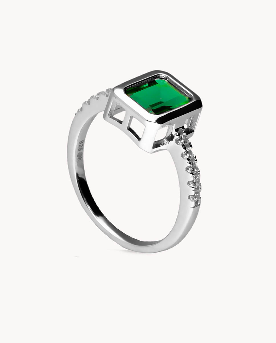 Anillo de plata de ley 925 bañada en rodio con circonita central color esmeralda de 5 mm x 8 mm (ancho por alto) y carril de circonitas blancas en ambos laterales.