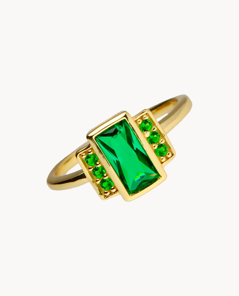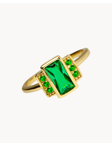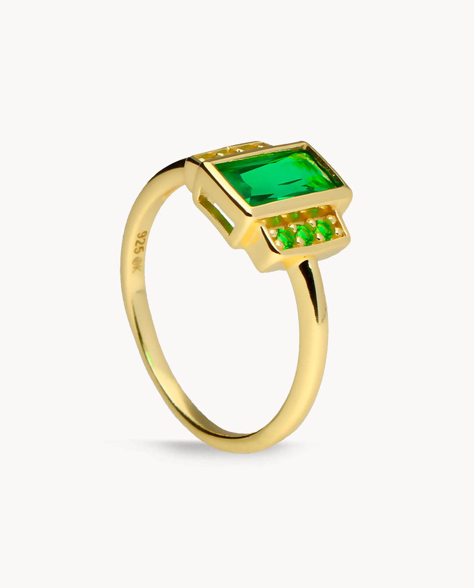 Anillo de plata de ley 925 bañada en oro 18K con circonita central color esmeralda de 4 mm x 8 mm (ancho por alto) y en los lados tres circonitas color esmeralda.