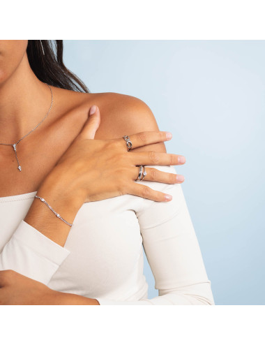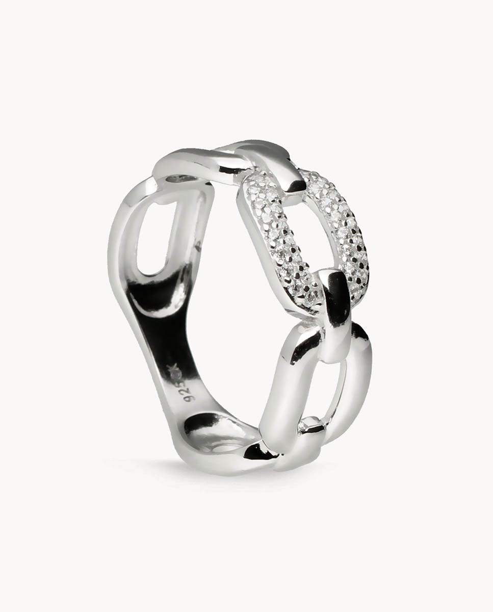 Anillo de plata de ley 925 bañada en rodio con eslabones marineros, uno de ellos con circonitas blancas.