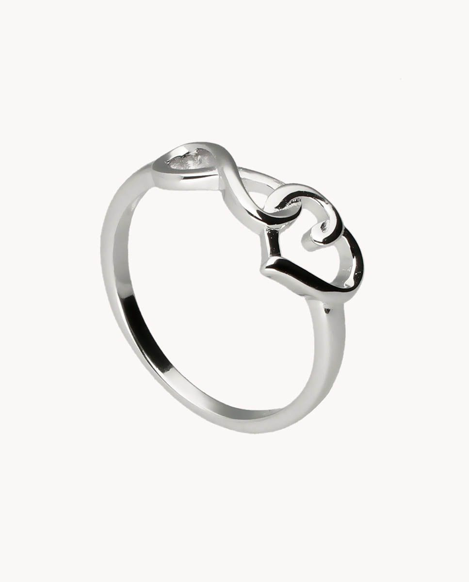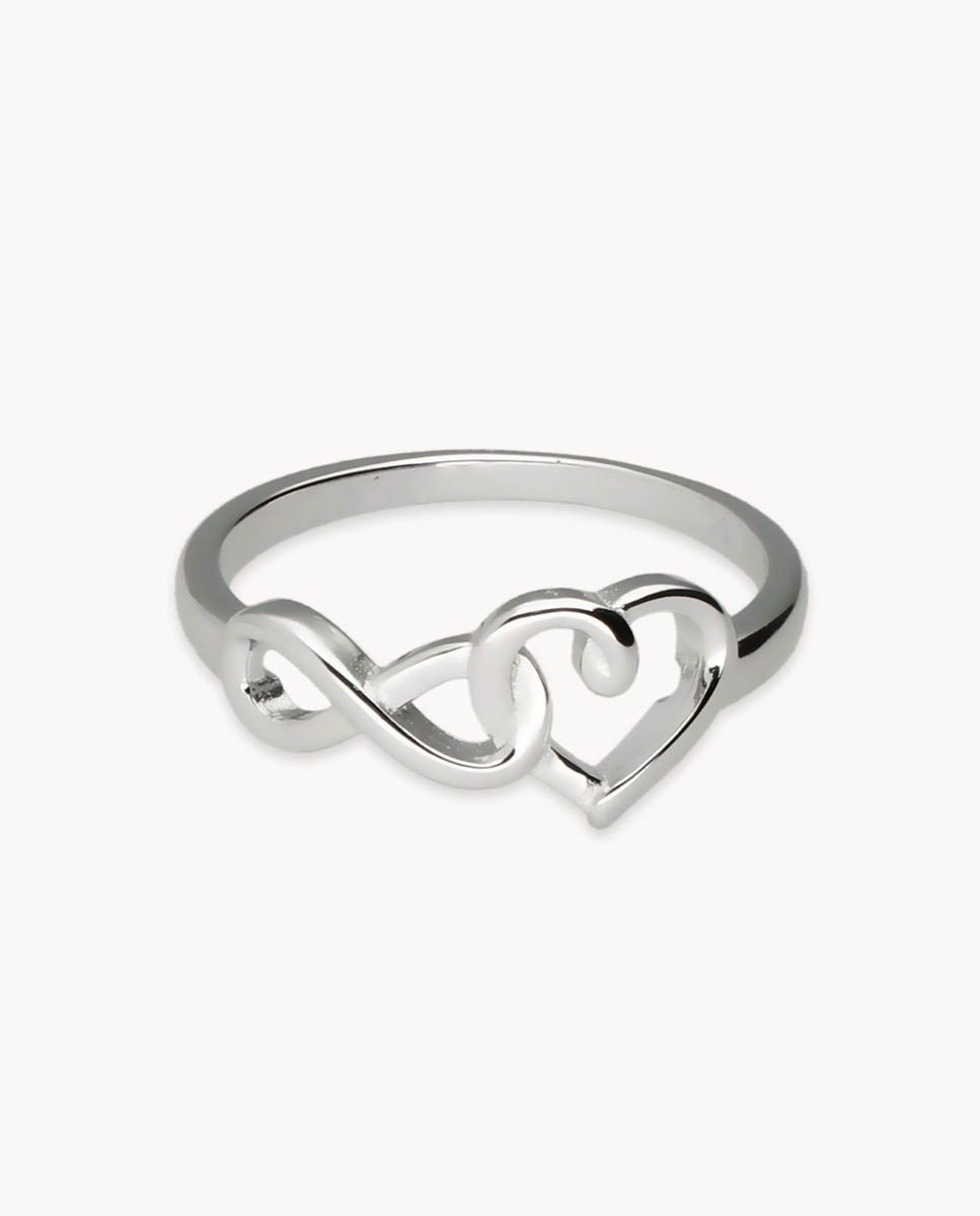 Anillo de plata de ley 925 bañada en rodio con infinito y corazón entrelazados de 15 mm de largo.
