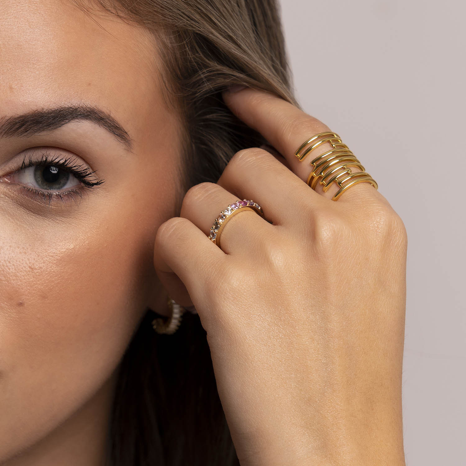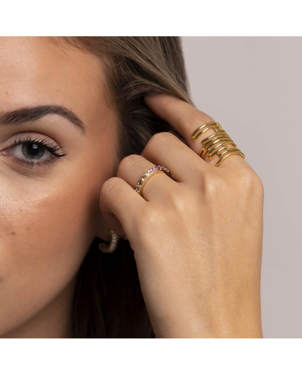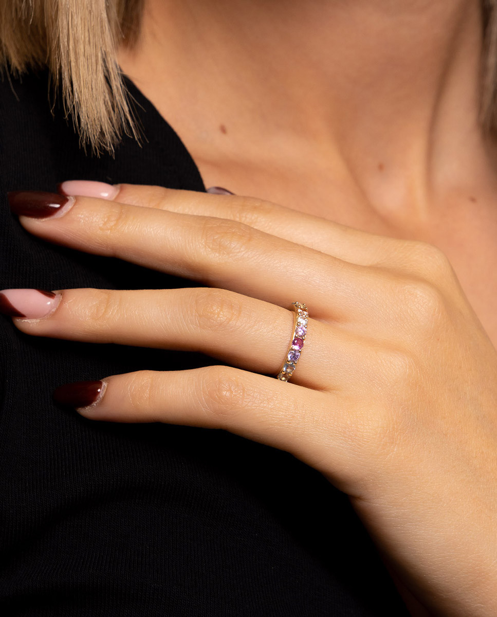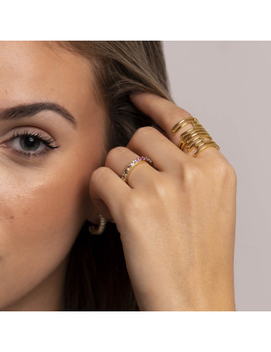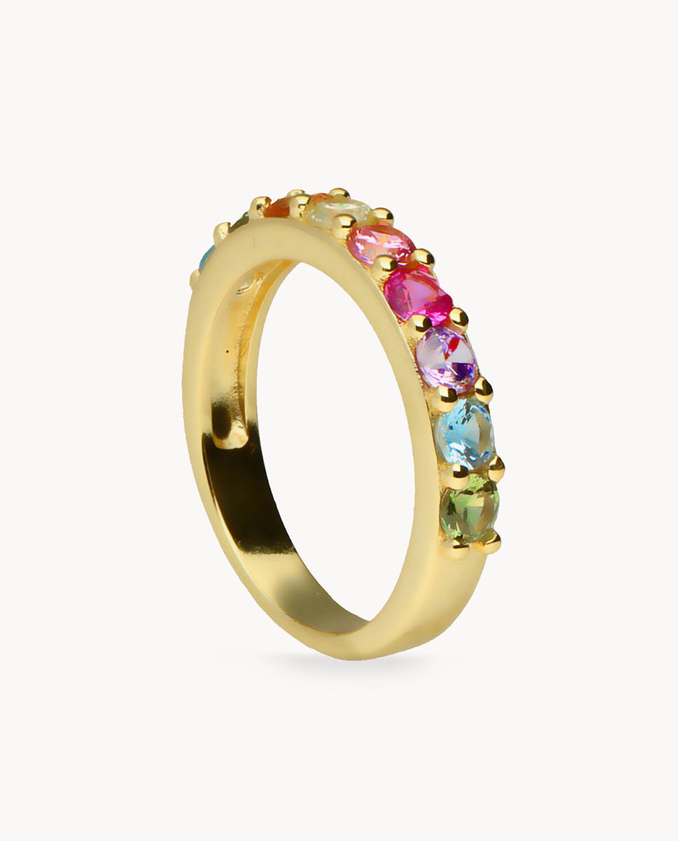 Anillo de plata de ley 925 bañada en oro 18K tipo media alianza con circonitas multicolor.