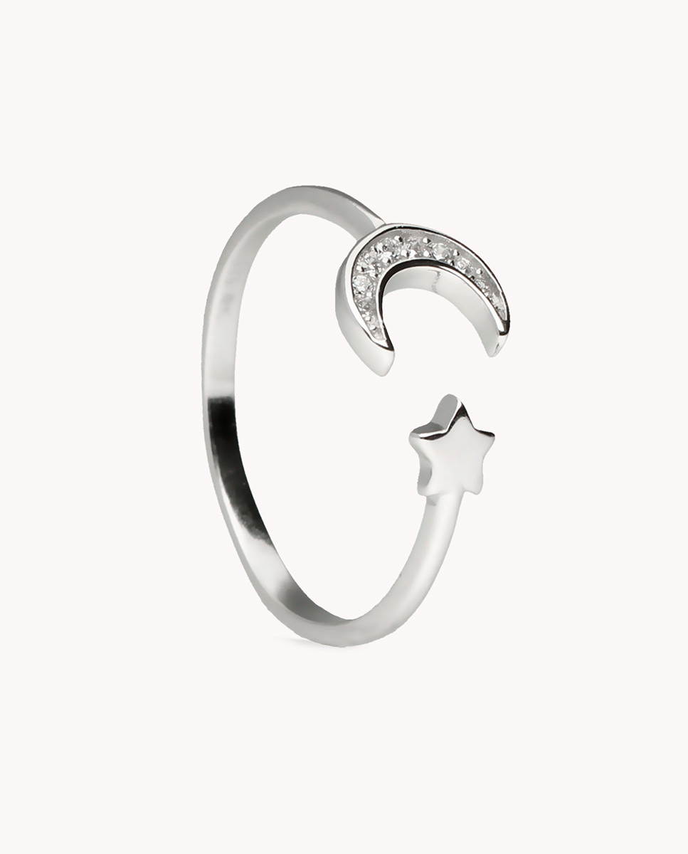 Anillo abierto de plata de ley 925 bañada en rodio con estrella y luna de circonitas blancas.Cómodo anillo ajustable para llevar en el dedo que prefieras.
