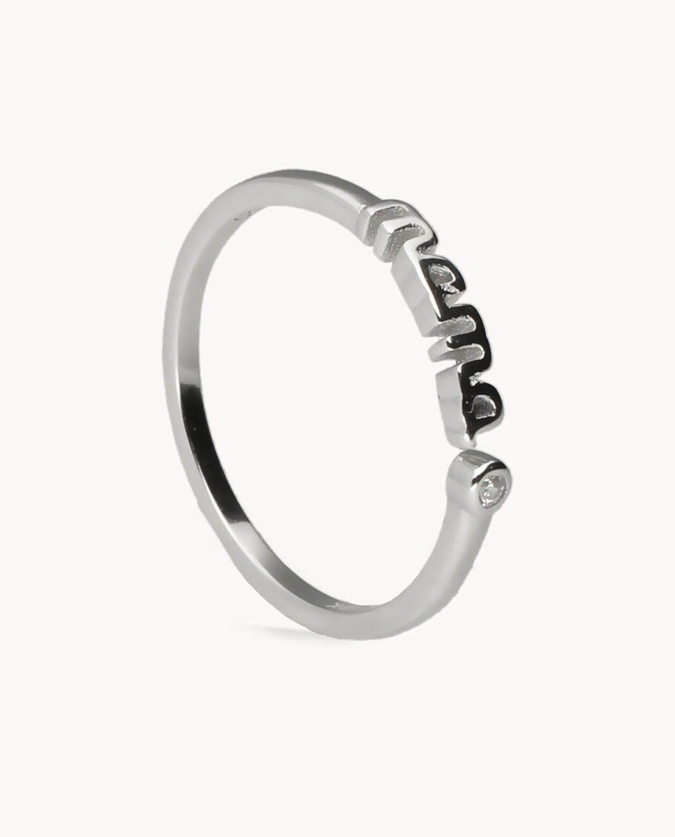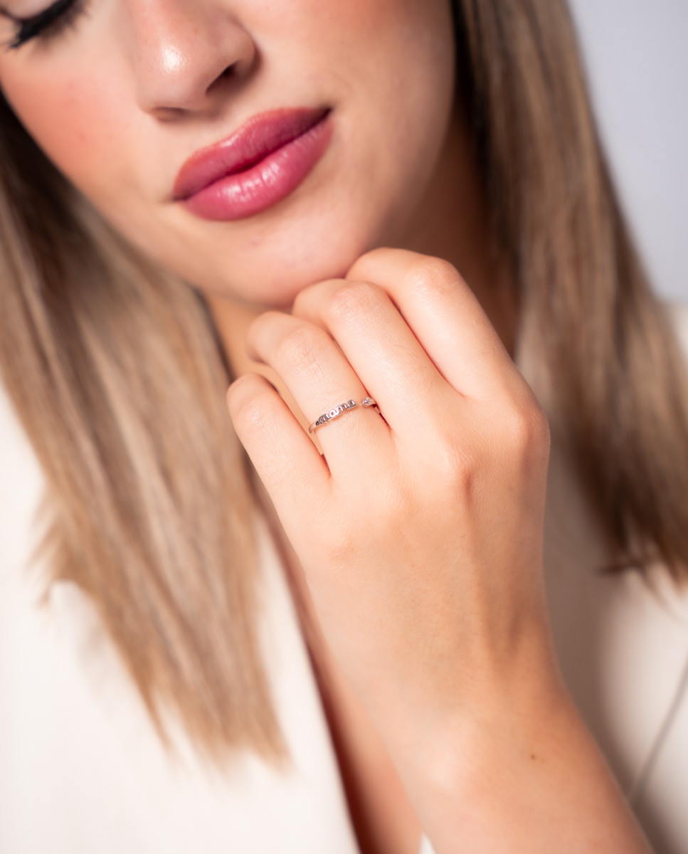 Anillo de plata de ley 925 bañada en rodio con circonita de 2 mm de diámetro en un extremo y en el otro extremo escrito Mamá.