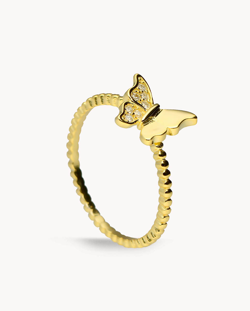 Anillo monarca de plata de ley 925 bañado en oro con mariposa y circonitas