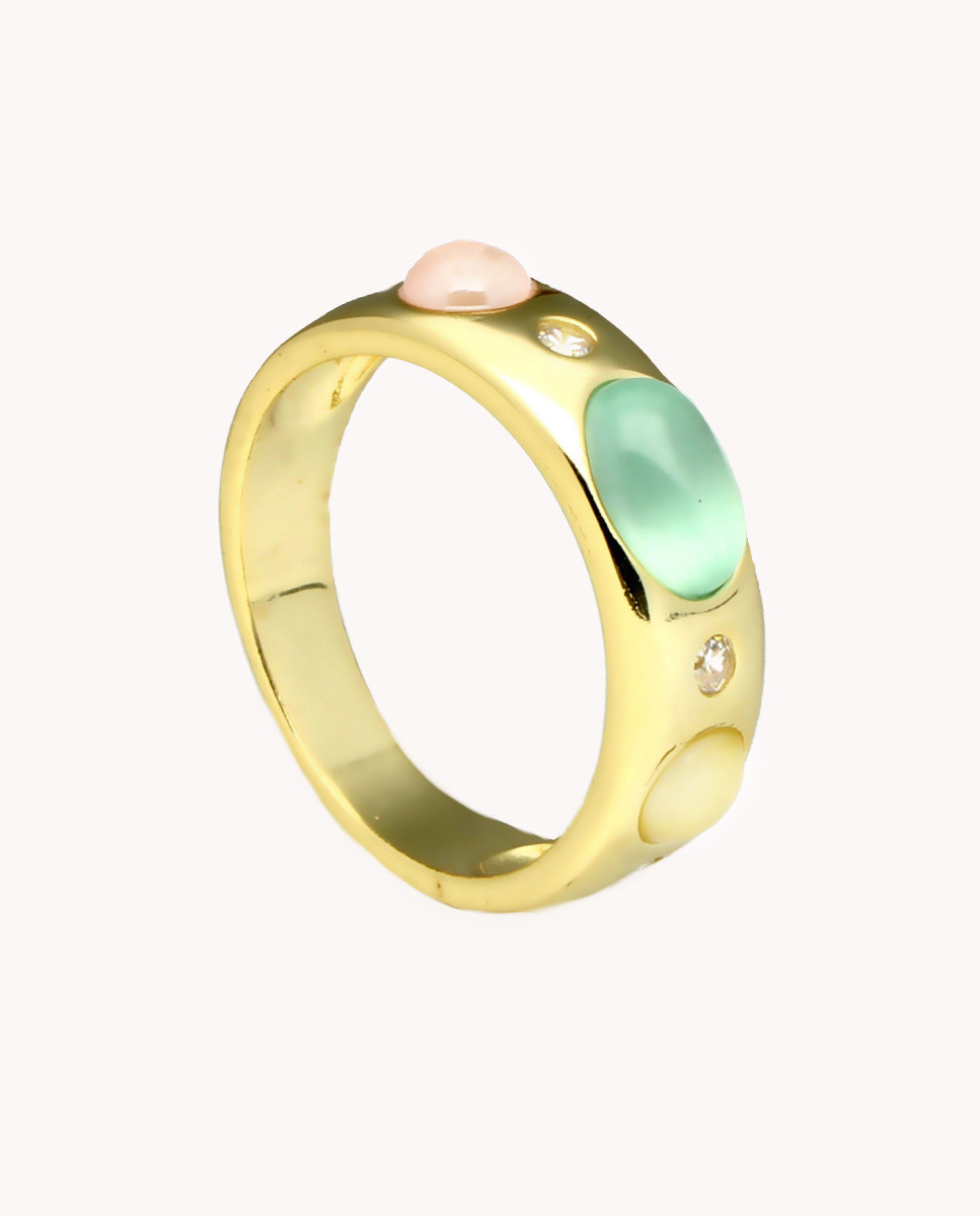 Anillo de plata de ley 925 bañada en oro 18K con piedras naturales en tonos pasteles y circonitas blancas intercaladas, 6 mm aproximadamente. El color de las piedras podría variar.