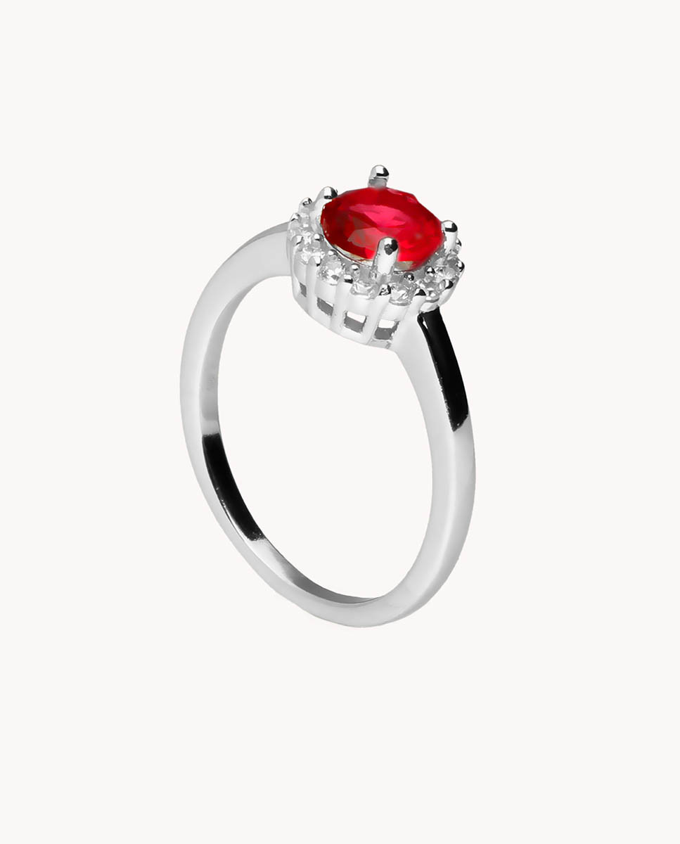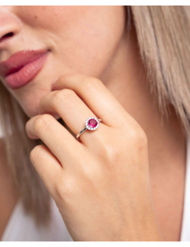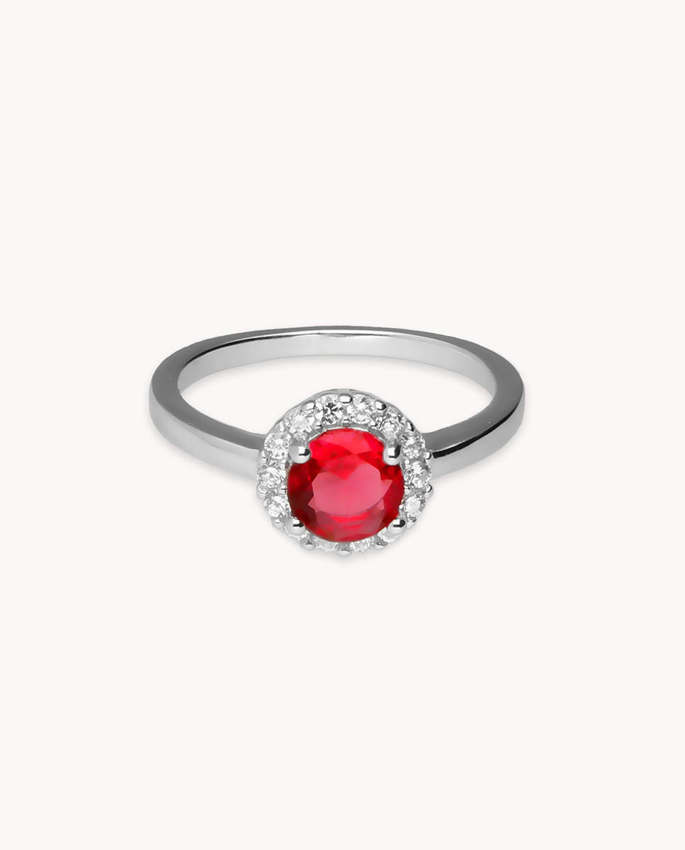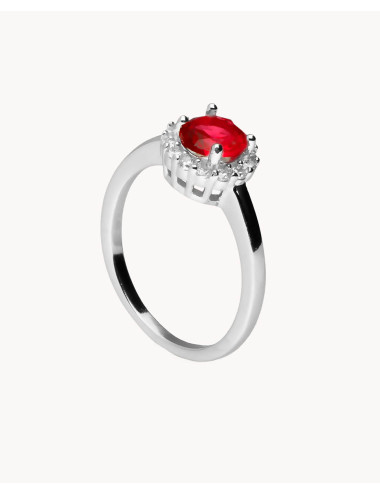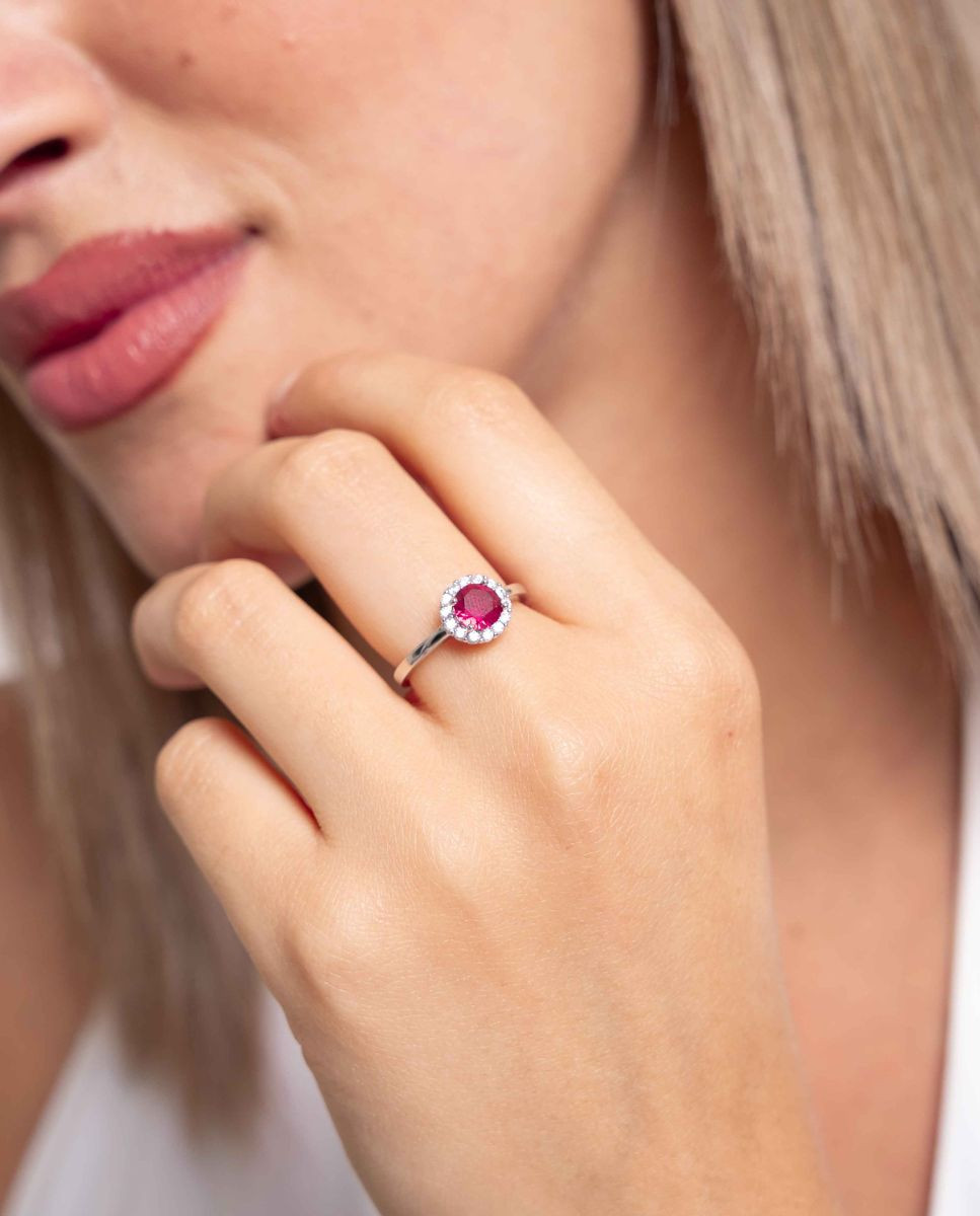 Anillo de plata de ley 925 bañada en rodio con circonita central color granate de 6 mm de diámetro y contorno de circonitas blancas.