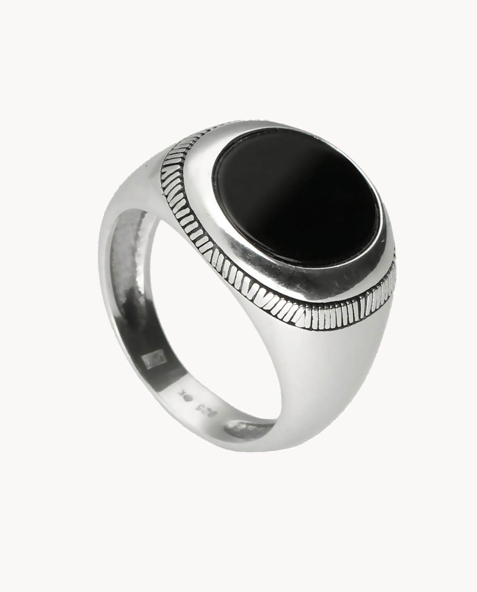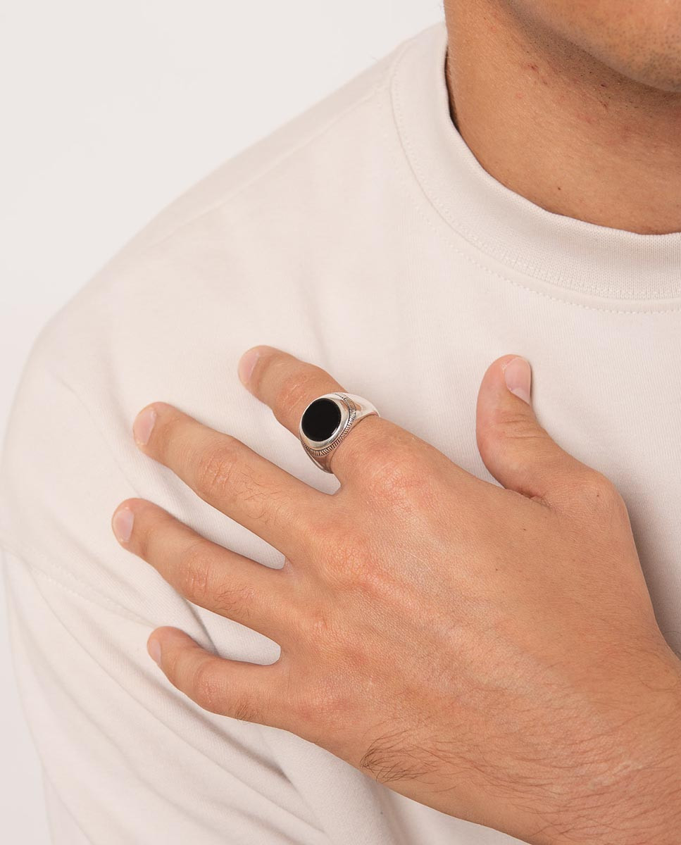 Anillo tipo sello de plata de ley 925 bañada en rodio en forma ovalada con onix negro 12 mm x 13 mm (ancho por alto).